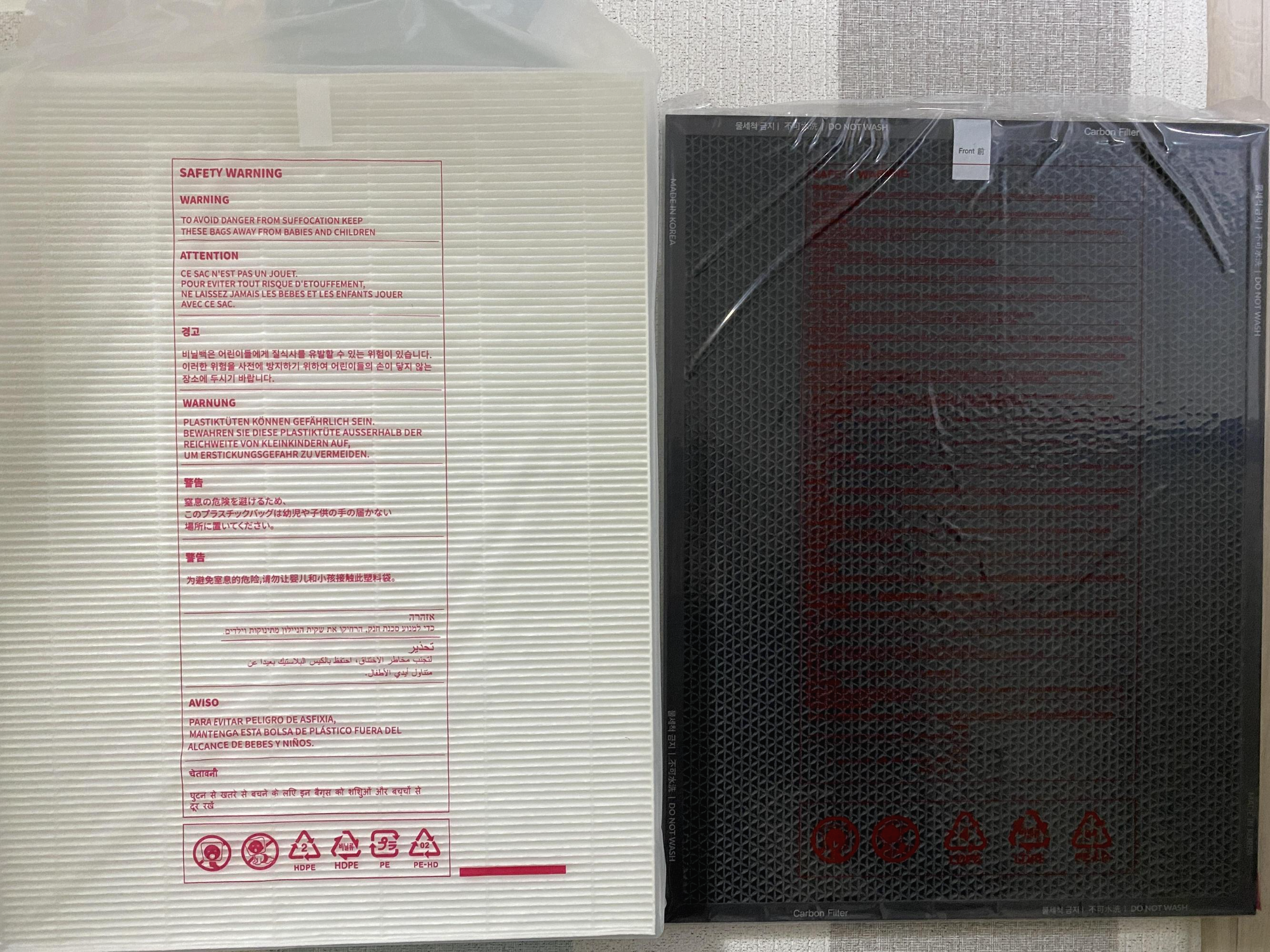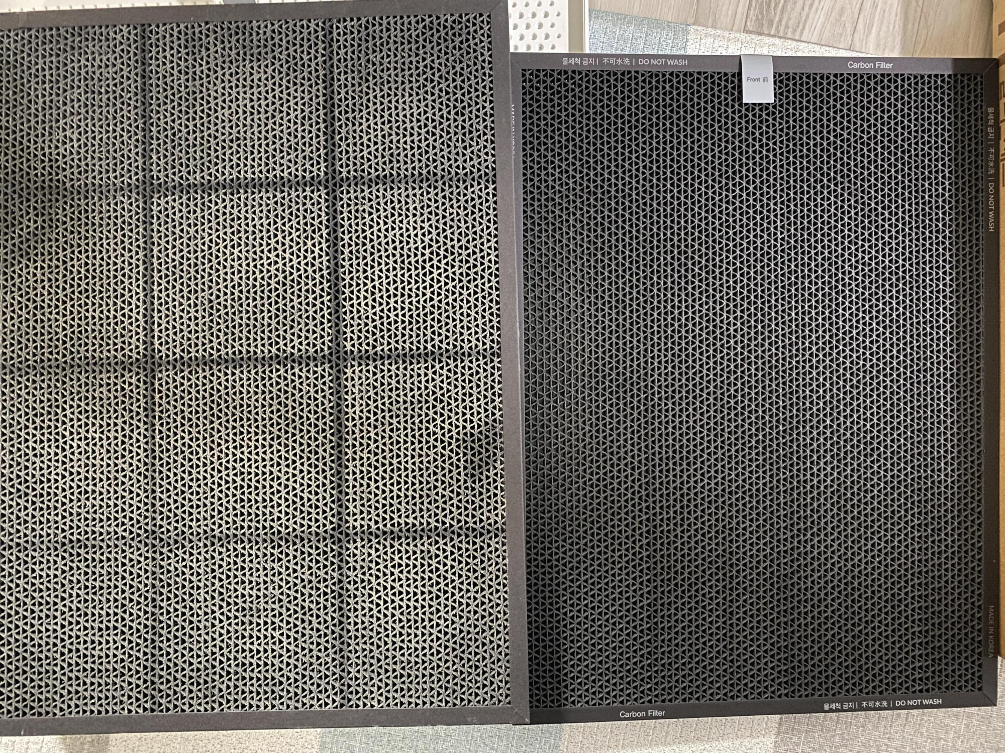 그럼 carbon 필터도 먼지에 따른 오염도가 눈에 보일정도로 차이가 날까? 물론이다. 1년동안 사용한 필터는 왼쪽과 같이 먼지를 먹어서 밝은 회색으로 변했고, 박스에서 막 꺼낸 필터는 검정에 가까운 회색을 보여준다.