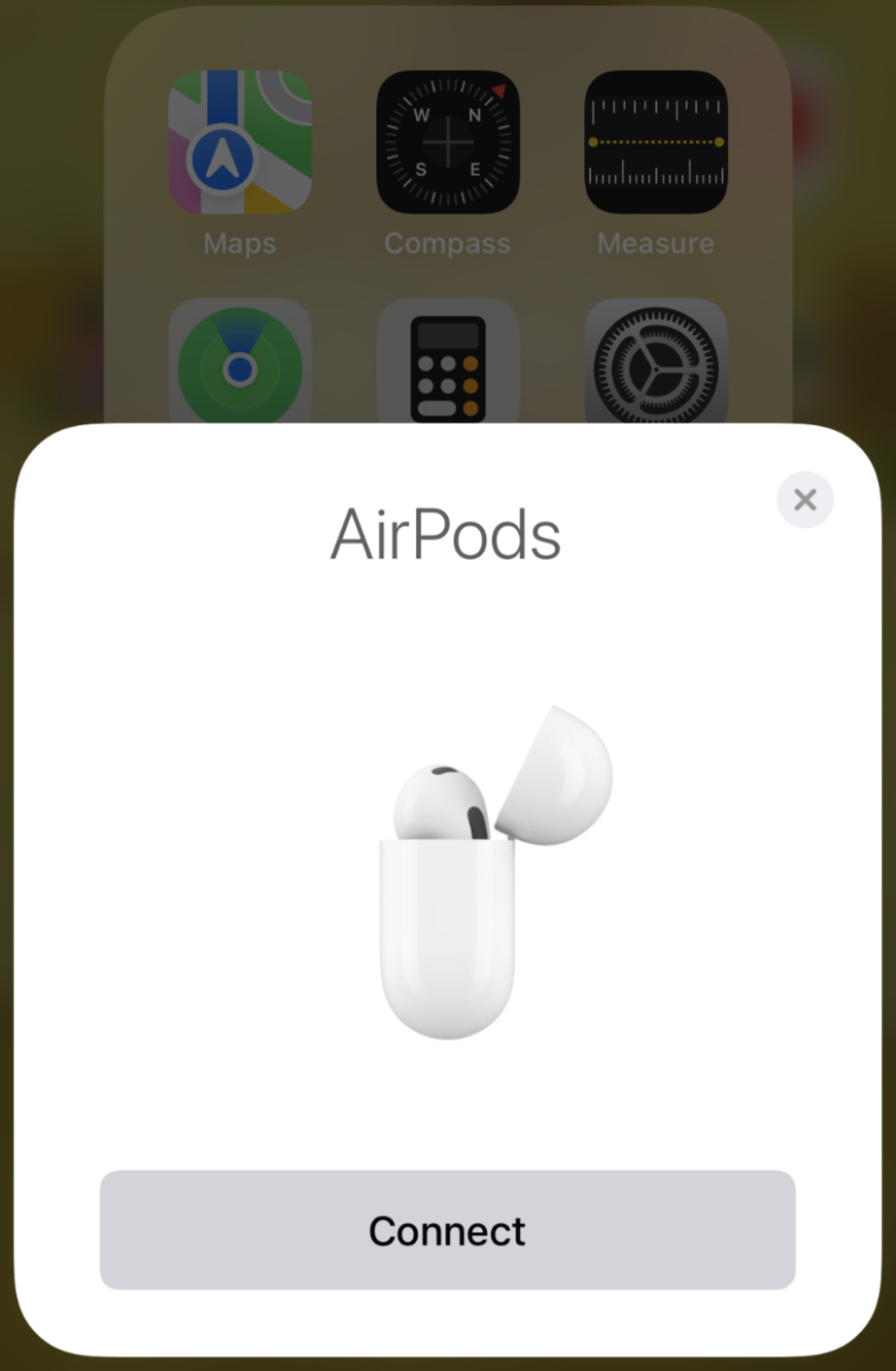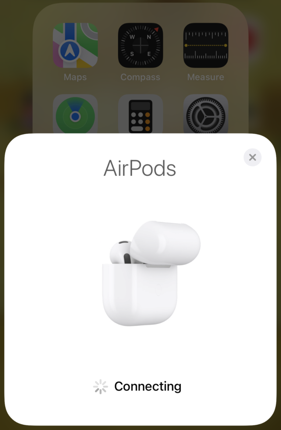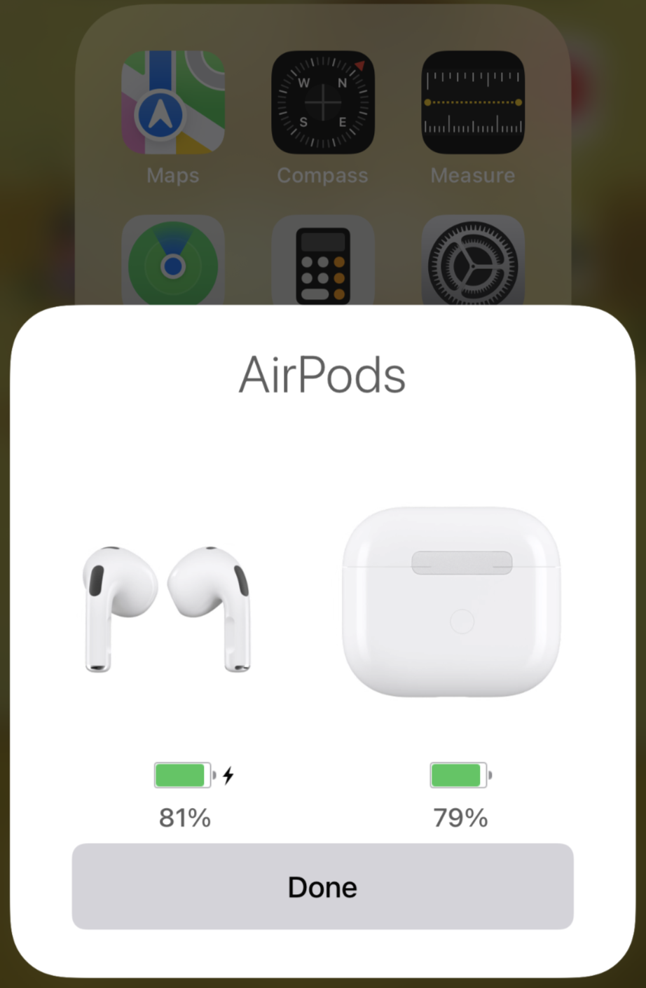 아이폰과 연결을 위해서는 에어팟 케이스 및 박스를 꺼내서 아이폰 근처에 두기만 하면 된다. 그러면 아래와 같이, 연결하겠냐고 물어본다. 연결을 누르면 쭉쭉 진행된다. 배터리 상태는 아래와 같이 충전되어 있었다. 소리가 잘 나는지만 확인 한 후에 지금은 충전중에 있다.