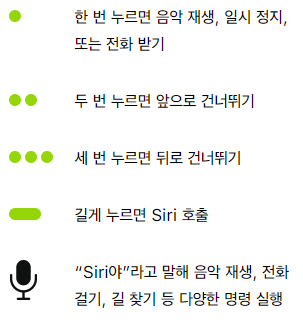 에어팟2세대는 조작을 위해 줄기를 툭툭, 뭉툭하게 쳐야했다. 이제는 눌러서 딸깍하는 느낌이 나면 된다. 왼쪽 오른쪽 모두 같은 기능을 가진다. 치는게 아니라, 버튼을 누르는 것이다. 아이폰7의 홈버튼 느낌을 떠올려보자.