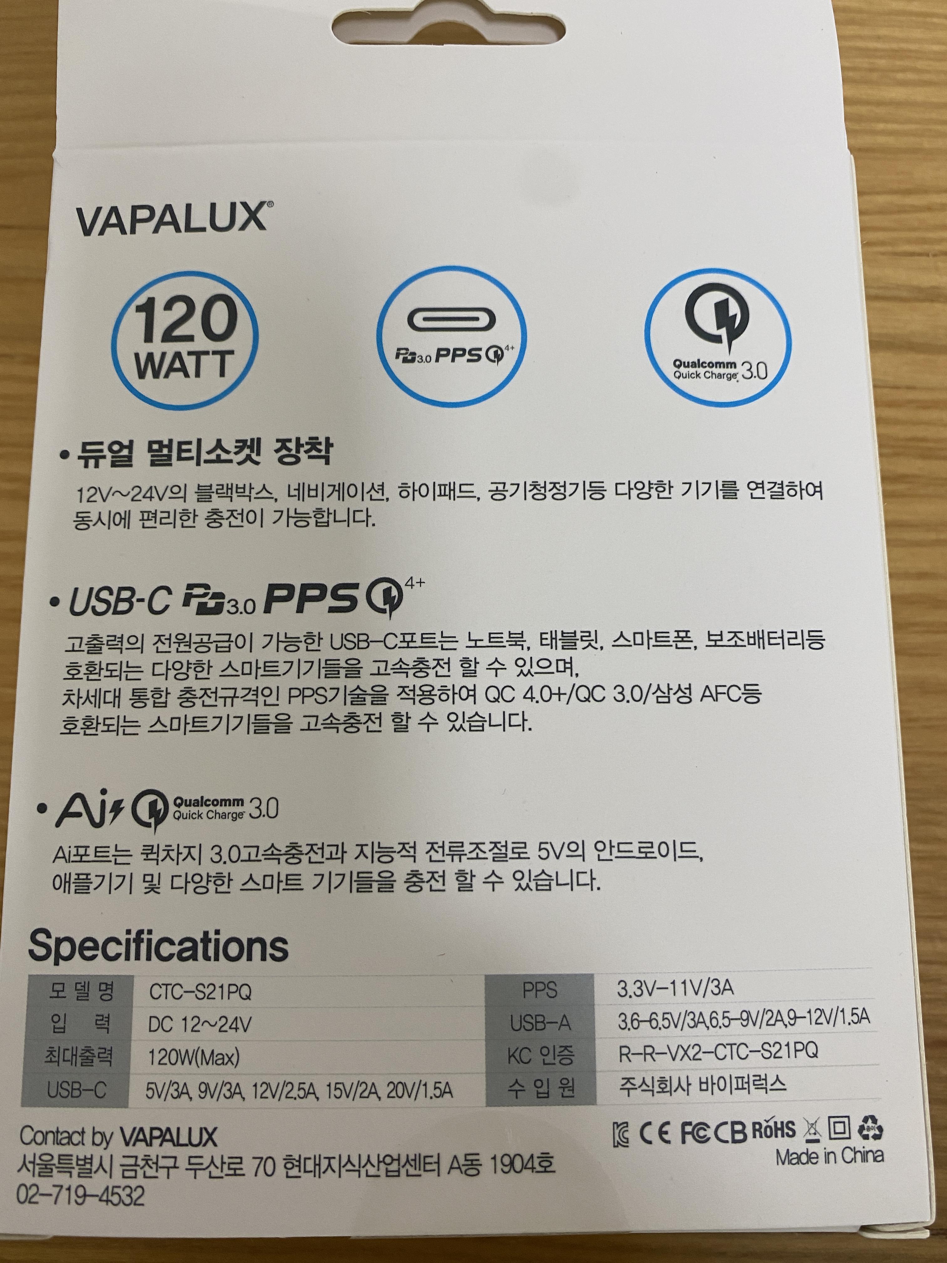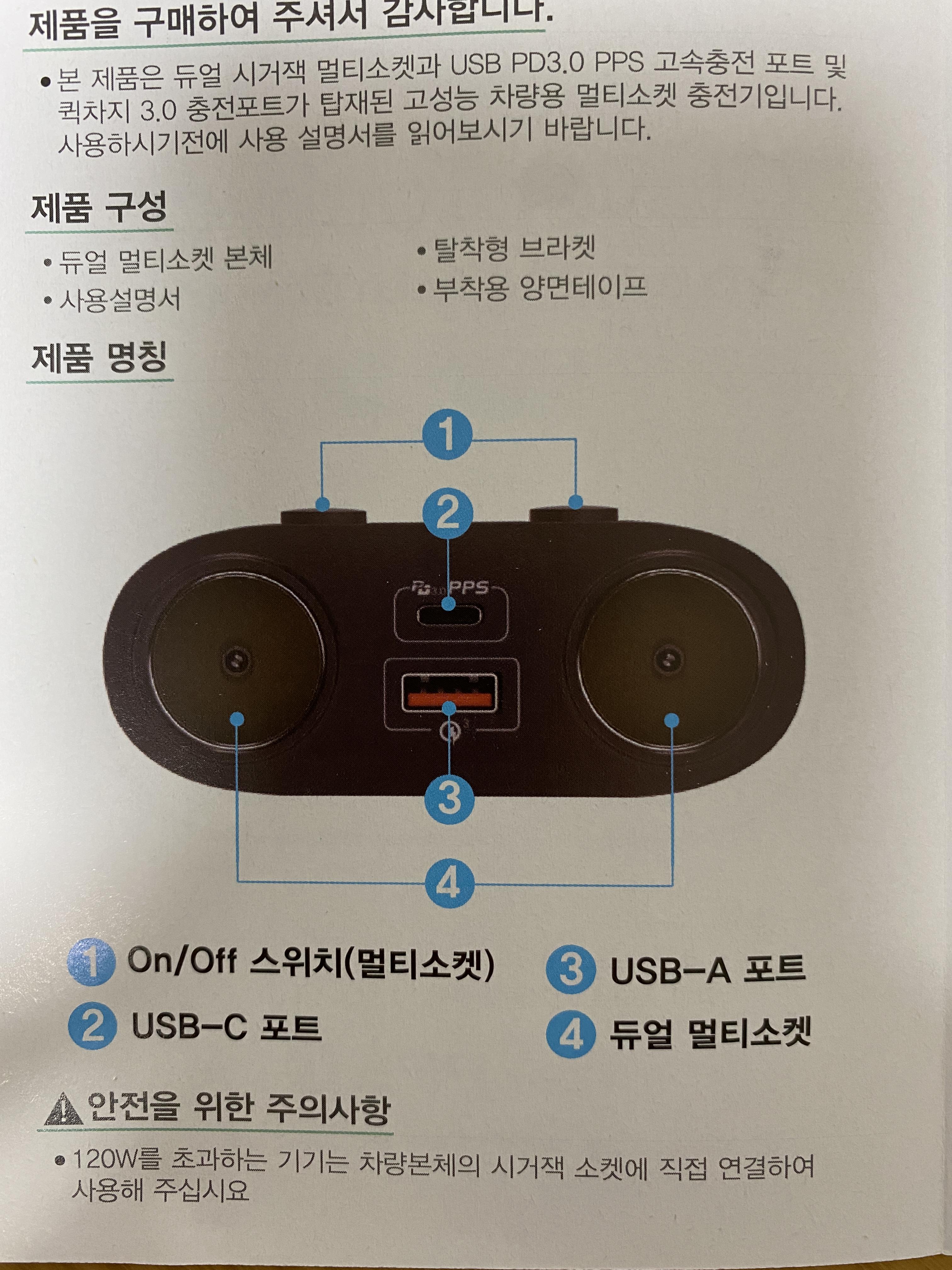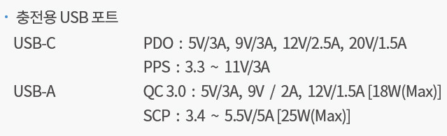 박스는 이렇게 생겼는데, 차에 부탁할수 있게 스티커가 포함되어 있다. 아래에서 보듯이 PD3.0 PPS (25.5W) 고속 충전기술이 적용되어 있고, USB-A와 USB-C 포트가 1개씩 달려 있다. 소켓 자체를 사용할일이 많지는 않지만 둘다 잘 사용되는 것을 확인했다.