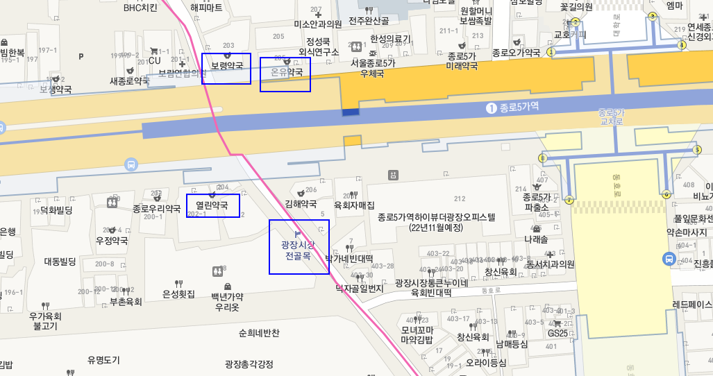 나는 광장시장 쪽에 있었는데, 반대편 보령약국으로 건너가려면 종로5가역 출입구를 이용해서 넘어가거나, 종로4가 사거리까지 걸어가서 넘어가야만 했었는데, 짐도 많고 그날 많이 걸어서 피곤한 관계로 우연찮게 열린약국을 이용하게 되었다. 어르신들도 상당히 많은 동네인데, 은근히 걸어다니기 불편한 구조이다.