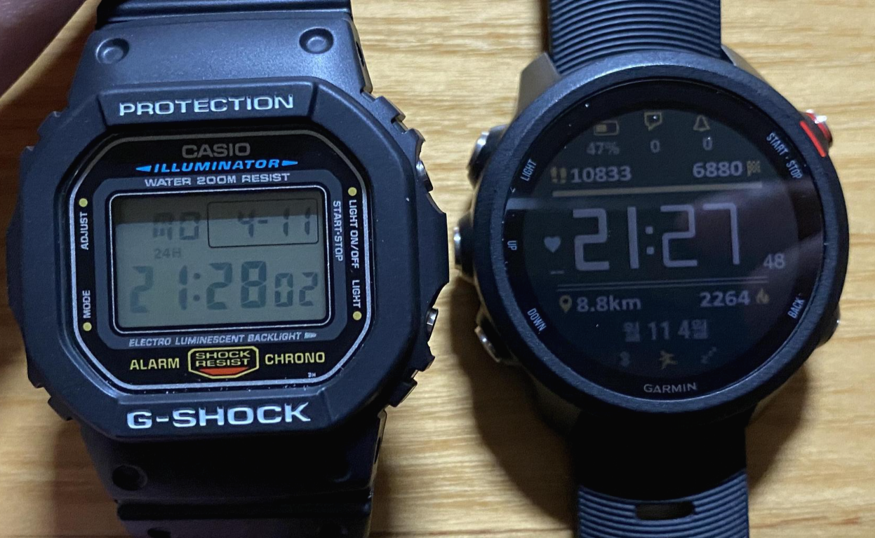 카시오 매장이 딱히 많은 것도 아니고, 실물 확인없이 바로 인터넷으로 주문을 했는데, 케이스 크기 비교를 위해 기존에 사용중인 포러너 245와의 크기를 비교해봤다. 지샥의 아래위 케이스 길이가 더 길고 접히지가 않아서 좀 튀어나와 보이는데, 내 눈에는 두께차이가 크게 나지는 않는다.