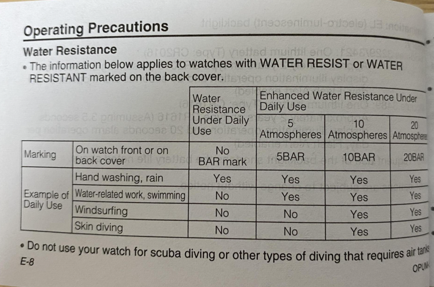 다음은 설명서에 나온 방수에 대한 이야기다. DW-5600E-1VDR은 200m, 즉 20 bar에 대한 물기둥에 대해 방수가 가능한 시계이다. 물놀이할때 딱 적당한 시계라고 볼 수 있다.