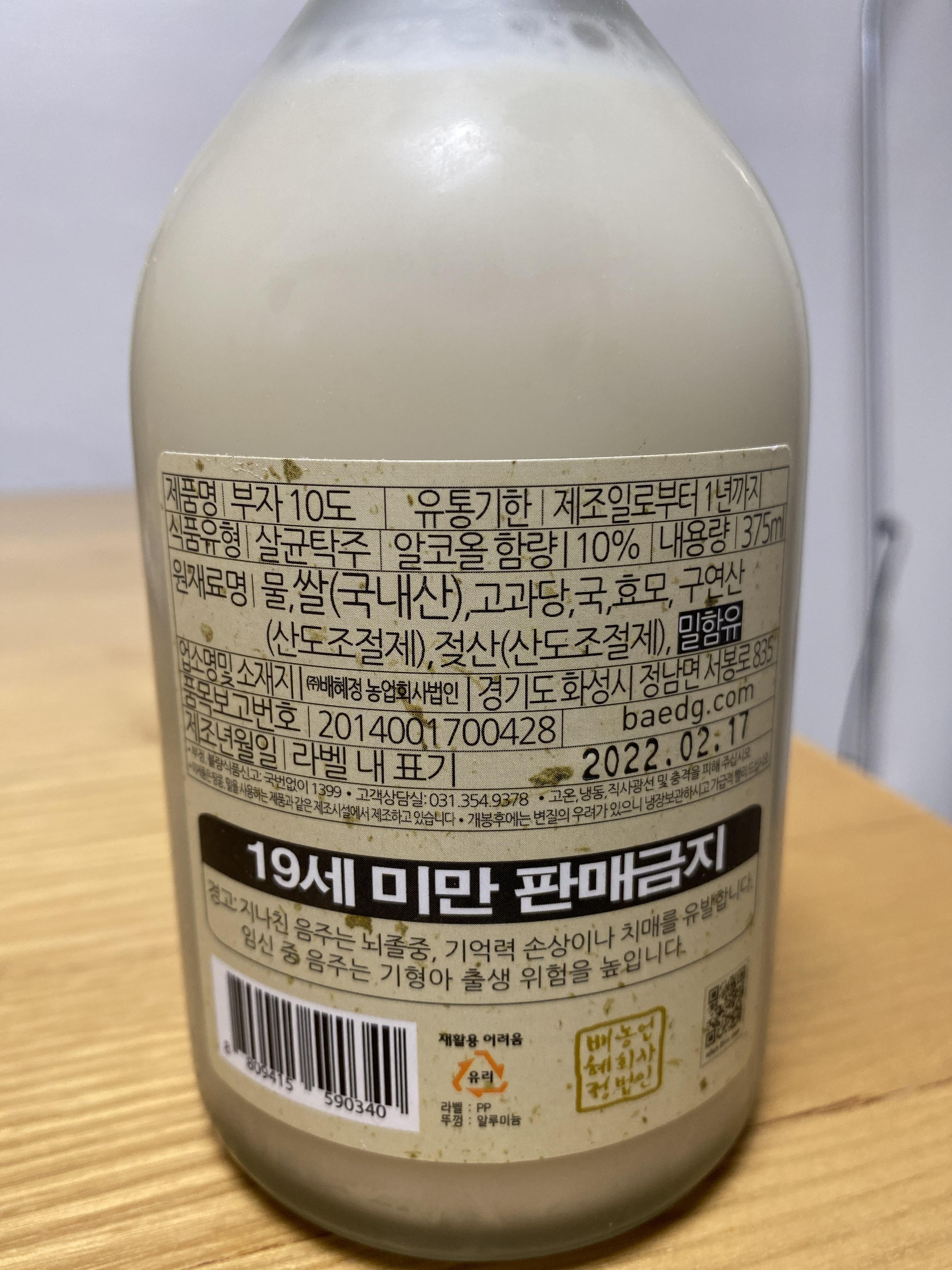 원재료를 보자. 물, 쌀, 고과당, 국, 효모, 구연산, 젖산이 들어있는데, 아마도 고과당이 아스파탐의 역할을 하는것으로 보인다. 유통기한도 1년이나 되고, 일반 막걸리와는 다르게 병에 담겨져 있어서 포장이 훨씬 깔끔하다.