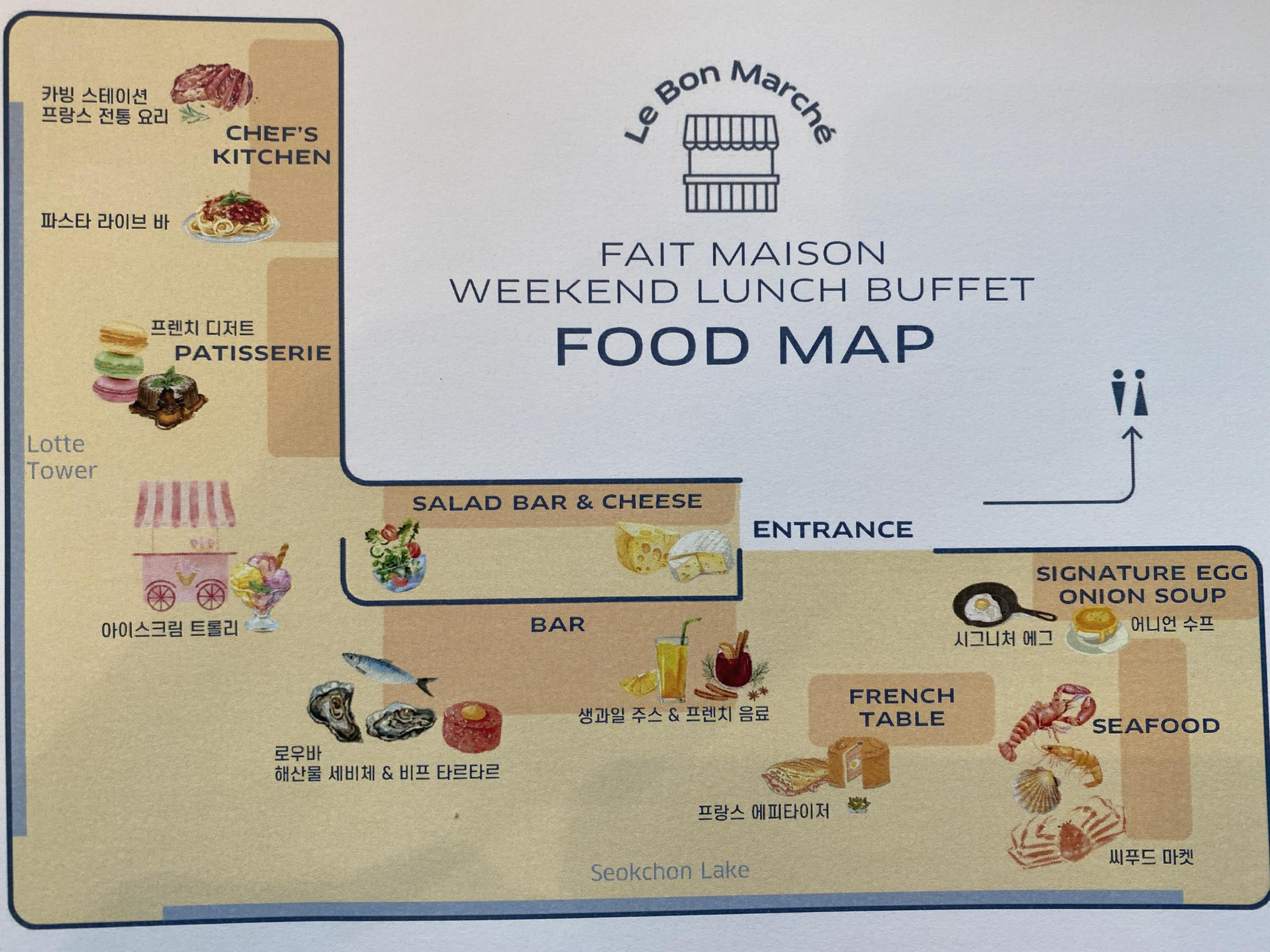 페메종 런치 사용 시간은 12시부터 3시까지인데, 너무 빡빡하지 않게 입장이 가능하고, 각 테이블마다, 아래와 같은 간단한 푸드맵을 제공하고 있어서 어떤 음식을 어디부터 먹을 것인지 간단하게 확인이 가능하다.