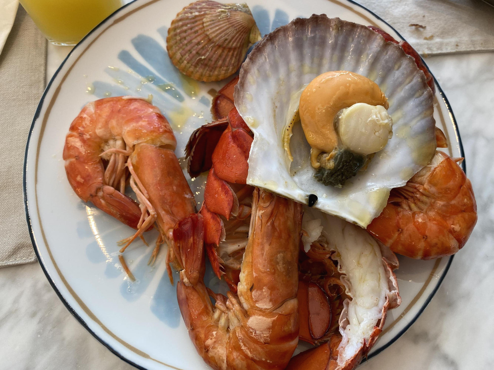 다음은 해산물로, 랍스터, 타이거새우, 조개, 전복을 2가지 소스 중에 하나로 만들어달라고 주문을 하고 자리에서 열심히 먹다가, 5~10분 정도 뒤에 가지러 가면 된다. (번호표를 나눠주는데, 따로 부르지는 않는다) 랍스터 꼬리랑 새우로 오랜만에 배를 채웠다. 2가지 소스 모두 맛있었다. 아래는 갈릭버터로 구워진 사진이다.