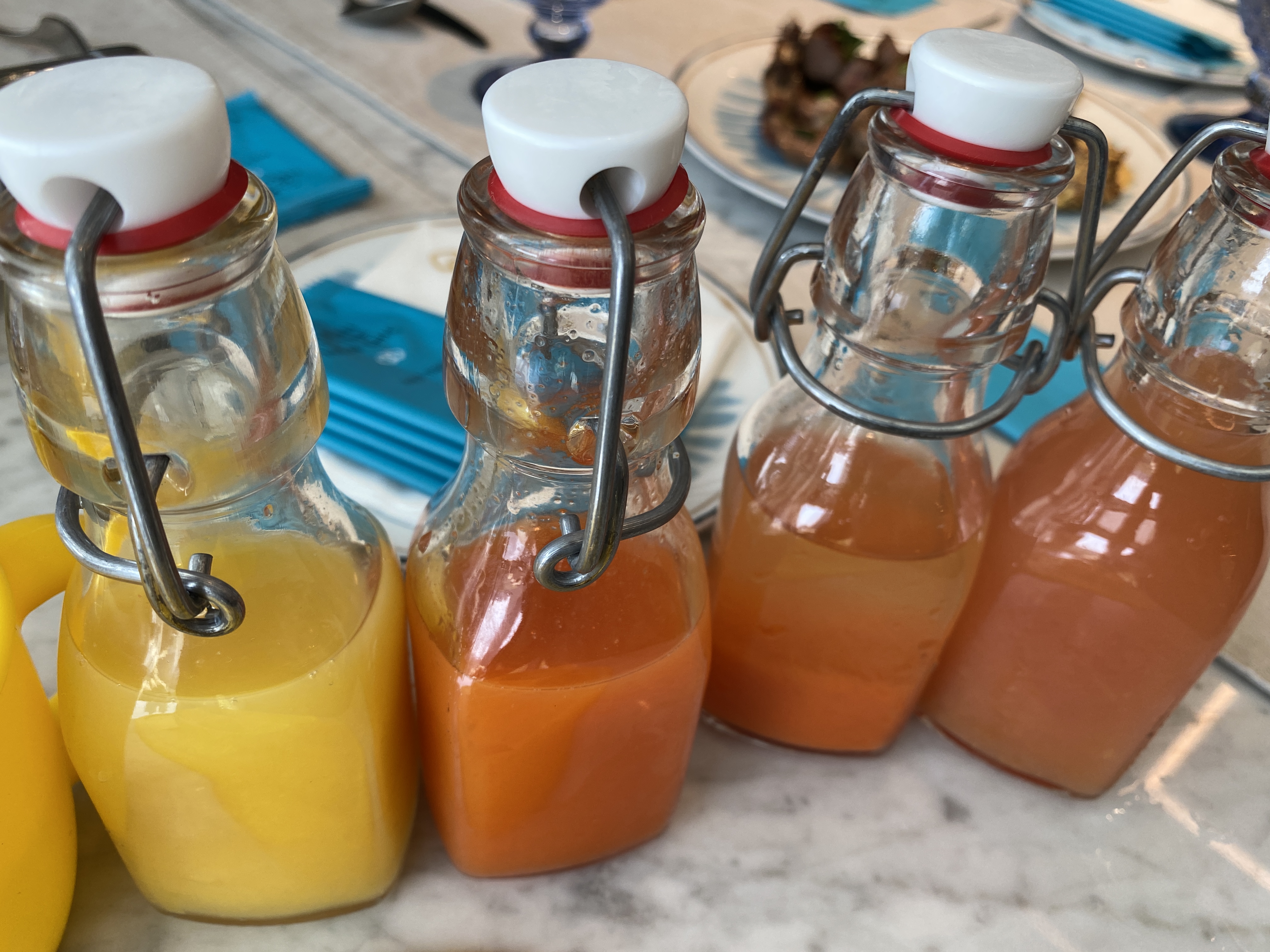 물은 직원분들이 자리를 돌아다니면서, 채워주는 방식이고, 음료의 경우, 생과일 주스 정도만 준비되는데, 이 생과일 주스가 설탕 덩어리와 시럽으로 만들어진 시중의 과일 주스와는 아주 다른맛을 보여주기 때문에, 페메종에서 제공하는 음식들과의 궁합이 상당히 좋았다. 호텔 부페에 와서 처음으로 탄산수 또는 탄산음료를 먹지 않게 된 것도, 전반적으로 담백한 음식들이 한몫했다고 볼 수 있다. 아래가 생과일 주스인데, 색이 비슷해보이지만, 전부 다른 맛이다. 개인적으로 매우 만족.