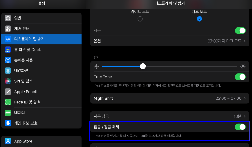 그래서 설정을 찾아봤다. 설정에서 디스플레이 및 밝기에 들어가면, 아래와 같이 하이라이트 된곳을 해제하면, 스마트 커버를 이용한 아이패드 자동 잠금 및 잠금 해제 기능을 끌수 있다.