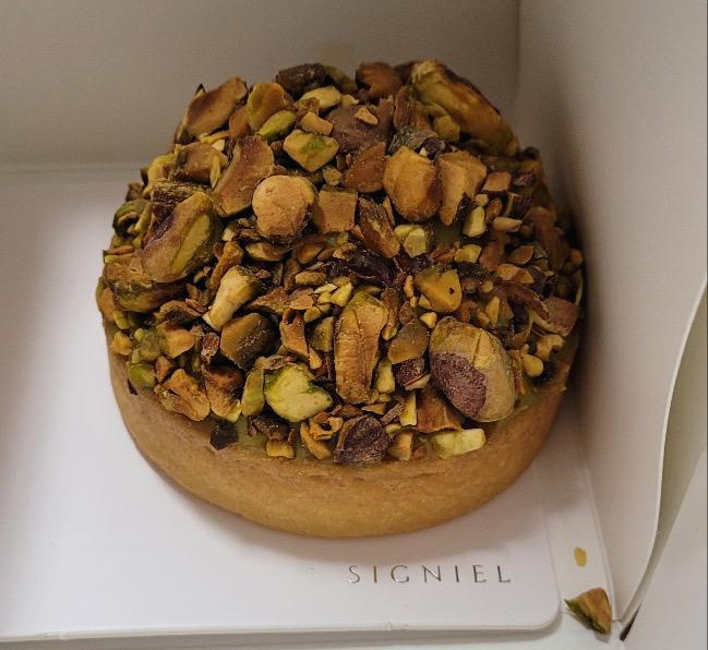 마지막으로 견과류 듬뿍...피스타치오 뭐시기..진짜 한가득이다. 녹차색과 비슷한 녹색의 크림이 올라가 있는데, 이것도 맛이 좋았다. 크기는 대략 스타벅스에서 파는 디저트 정도의 사이즈..