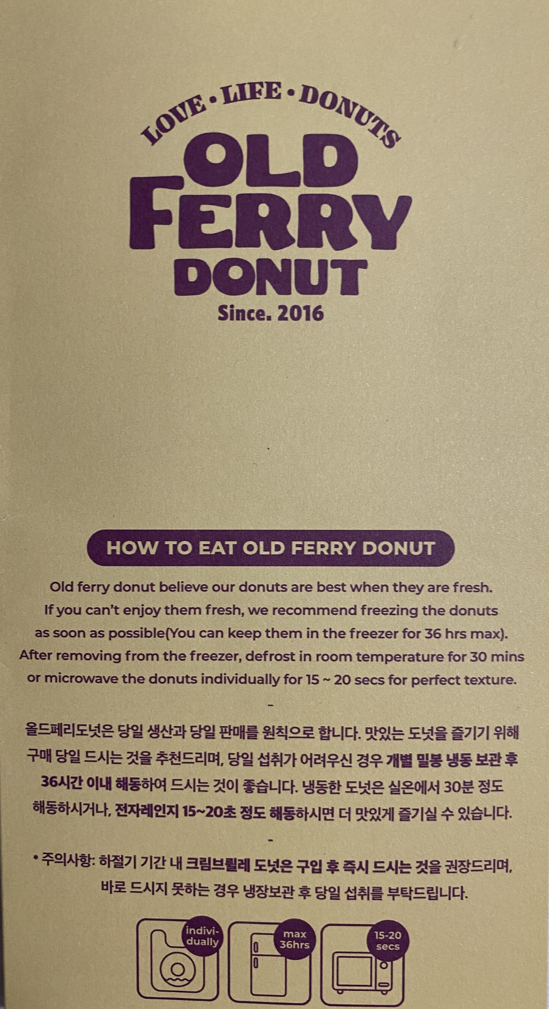 동네에 팝업매장 형식으로 올드페리 도넛을 팔고는 있었는데, 가끔 들릴때 마다 품절 상태여서 맛보지 못하다가 드디어 오늘 2개를 구입할 수 있었다. 뭐 그렇다고 이거먹자고 줄서서 기다린건 아니고, 그냥 우연히 들렸는데 재고가 남아서 사올 수 있었다. 브로슈어에는 어떻게 보관하고, 어떻게 먹어야하는지 간단한 설명이 나와 있다.