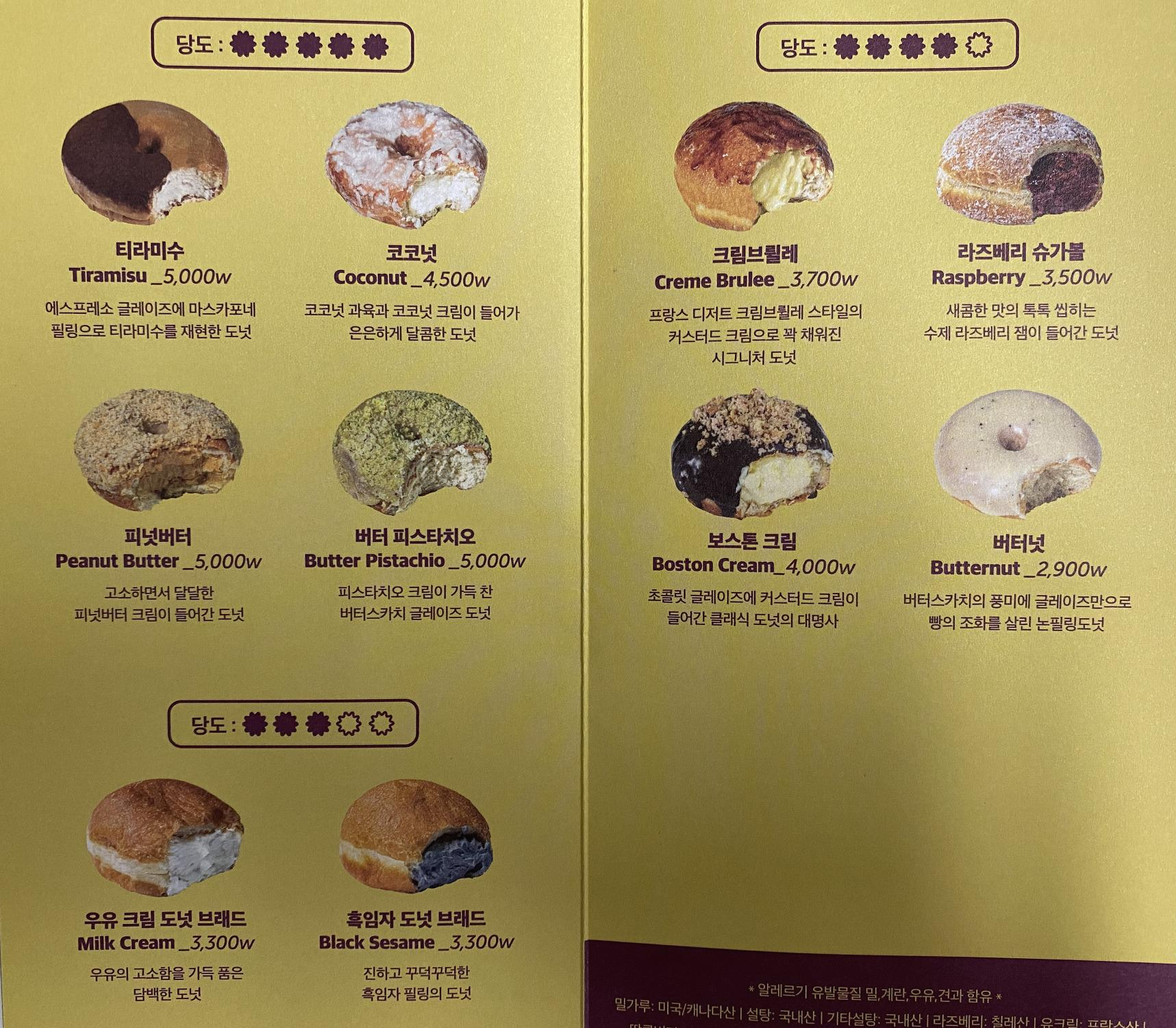 브로슈어를 펼쳐보면, 어떤 종류의 도넛을 판매하고 있는지, 당도에 따라 설명해주고 있는데 다양한 재료를 통해 만들어지고 있으며 가격도 그에 따라 차이가 난다.