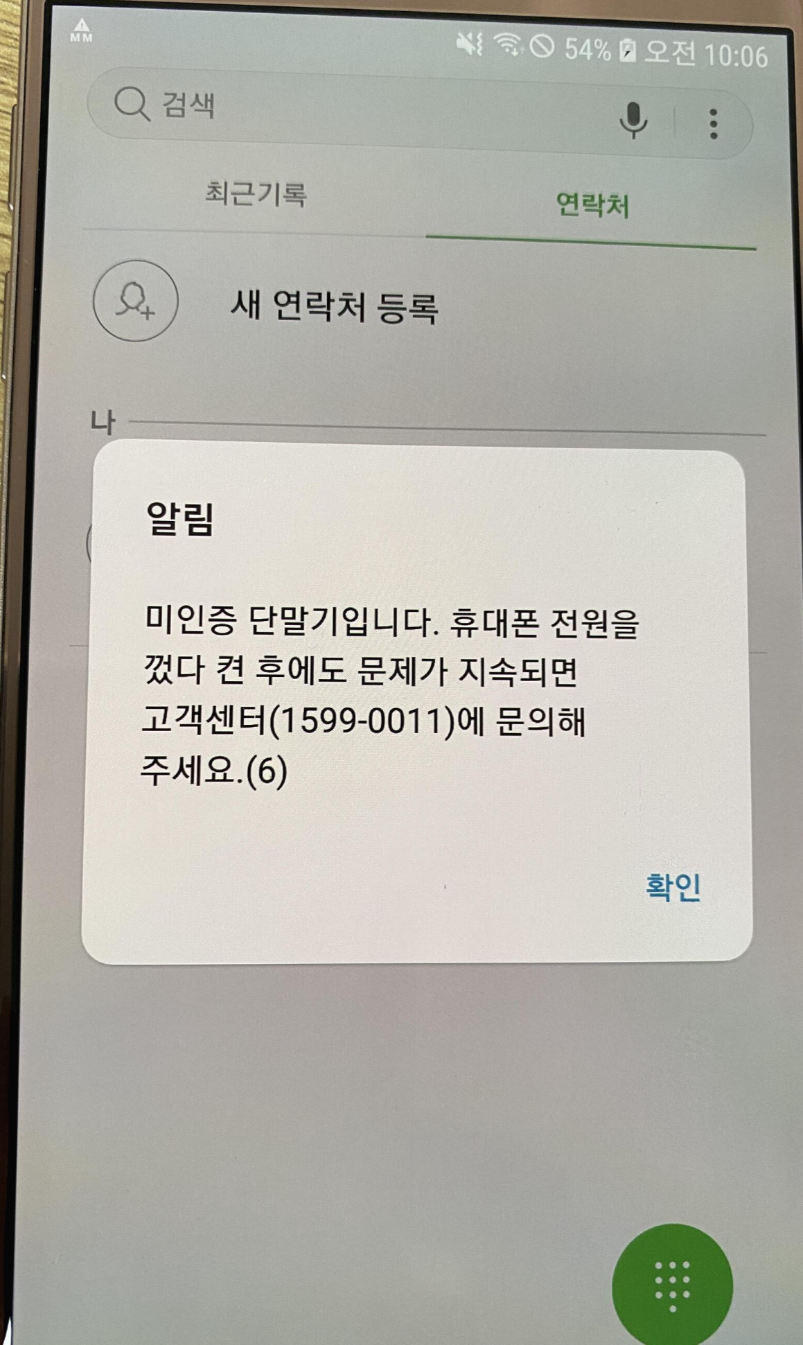 보통의 자급제 단말기에 유심이동은 그냥 유심칩만 이동시켜서 꼽아주면 된다. 아이폰에서 갤럭시로 유심칩을 이동시켜봤다. 그랬더니 아래와 같은 알림창이 떴다. 미인증 단말기라고 한다. 아래 고객센터에 전화해도 소용없다.