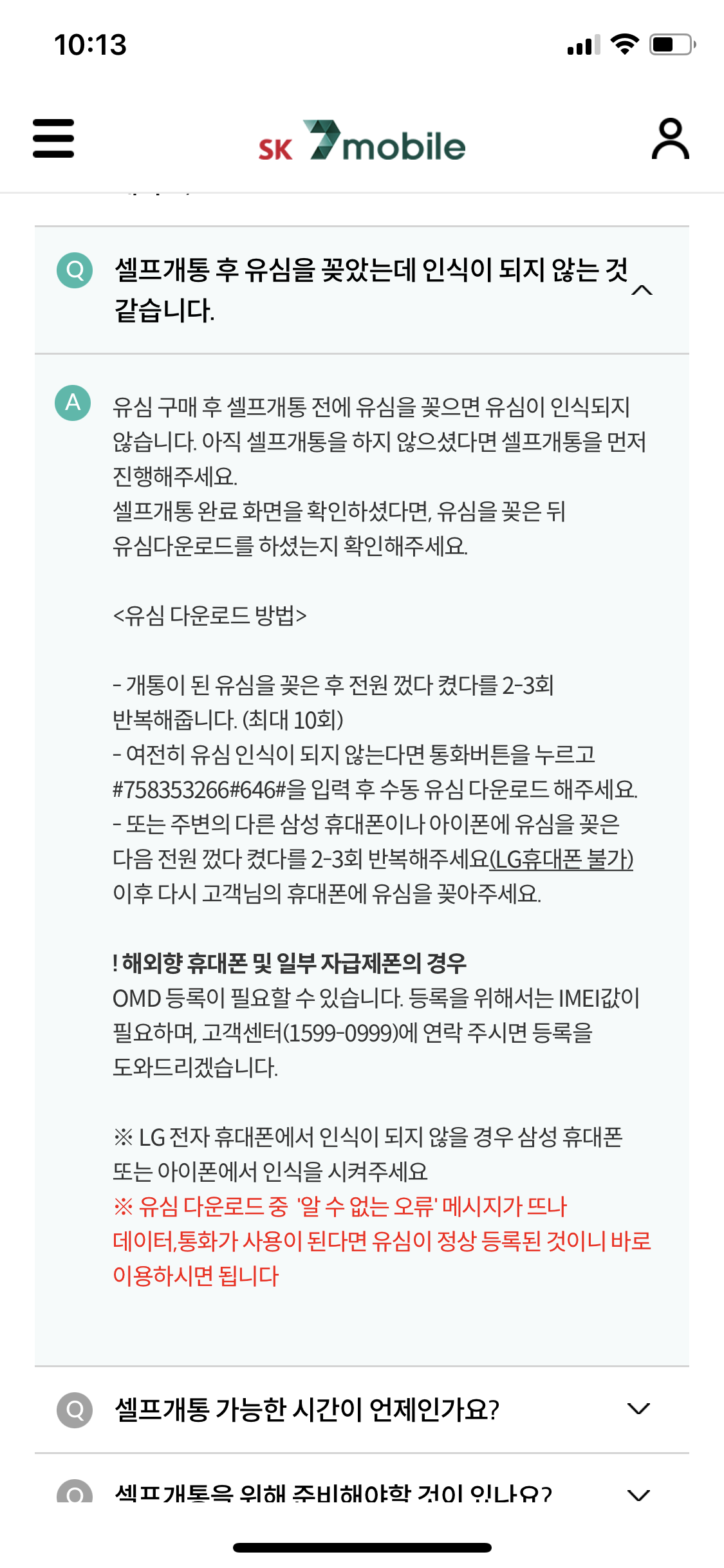 SK세븐모바일 홈페이지에 들어가 봤다. 고객센터 이런쪽에 사람들이 자주 고민하는 문제에 대한 해결책을 올려놓고는 한다. 폰이 바뀌었으니 유심 다운로드를 다시 해야 하는건가?라는 생각으로 아래에 나온 번호를 통해 유심 다운로드를 3회정도 시도해 본다.