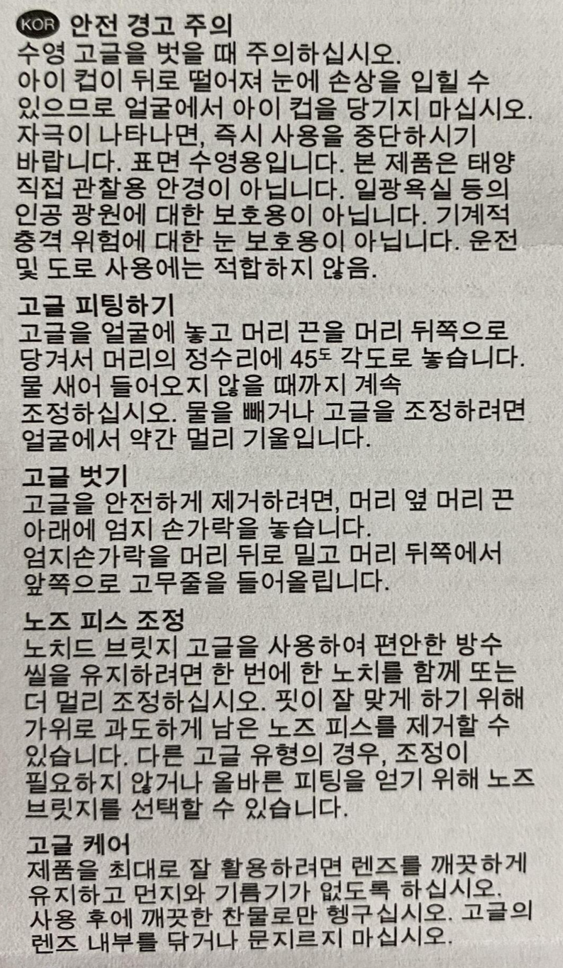 제품의 특징으로는 김서림 방지, 100% 자외선 차단, 라텍스 무첨가가 있는데, 개인적으로 물안경을 쓴지 너무 오래되서, 이런 특징이 얼마나 좋은것인지 비교는 못하겠고, 이정도는 되야 불편하지 않을테니, 다른 제품들도 이정도의 특징은 가지고 있지 않을까 생각해본다.