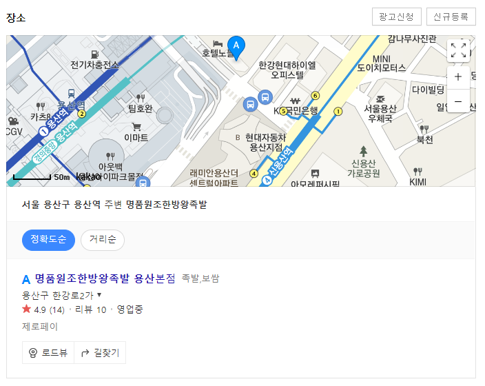 명품원조한방왕족발 용산본점이다. 신용산역 5번출구로 나간다면, 횡단보도도 건널필요가 없다. 그 동네 건물들이 주로 주상복합이라 아주 번쩍거리는데, 족발가게는 90년대 지어진 상가와 매우 유사한 모습을 갖고 있으니, 일단 심리적 진입 장벽이 매우 낮은 편이다. 안심해도 좋다.