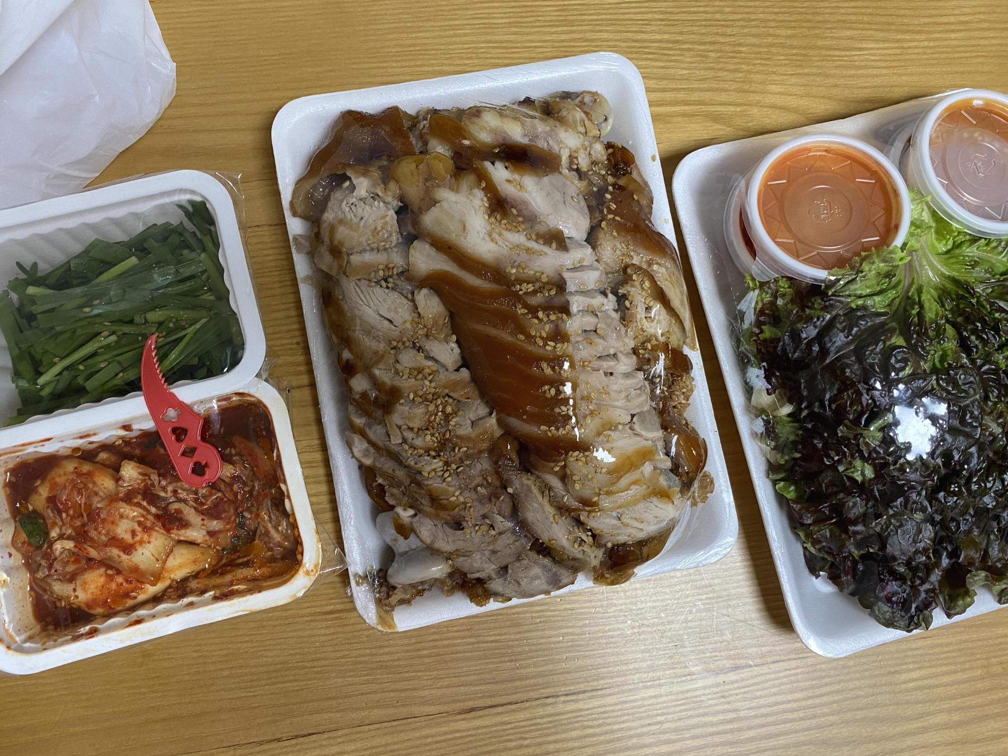 마늘과 고추가 없다고? 아니다. 상추 밑에 적당량이 깔려있다. 내 입에 고추는 약간 매웠다. 부추는 간장 양념이 바닥에 깔려있으니 잘 비벼서 먹으면 되고, 쌈장과 새우젓, 그리고 양념범벅의 김치가 있다. 김치는 익었다기 보다는 양념으로 인한 강한맛을 내뿜고 있었는데, 이건 어느동네 김치 특징인지 잘모르겠지만, 족발과의 궁합이 괜찮았다.