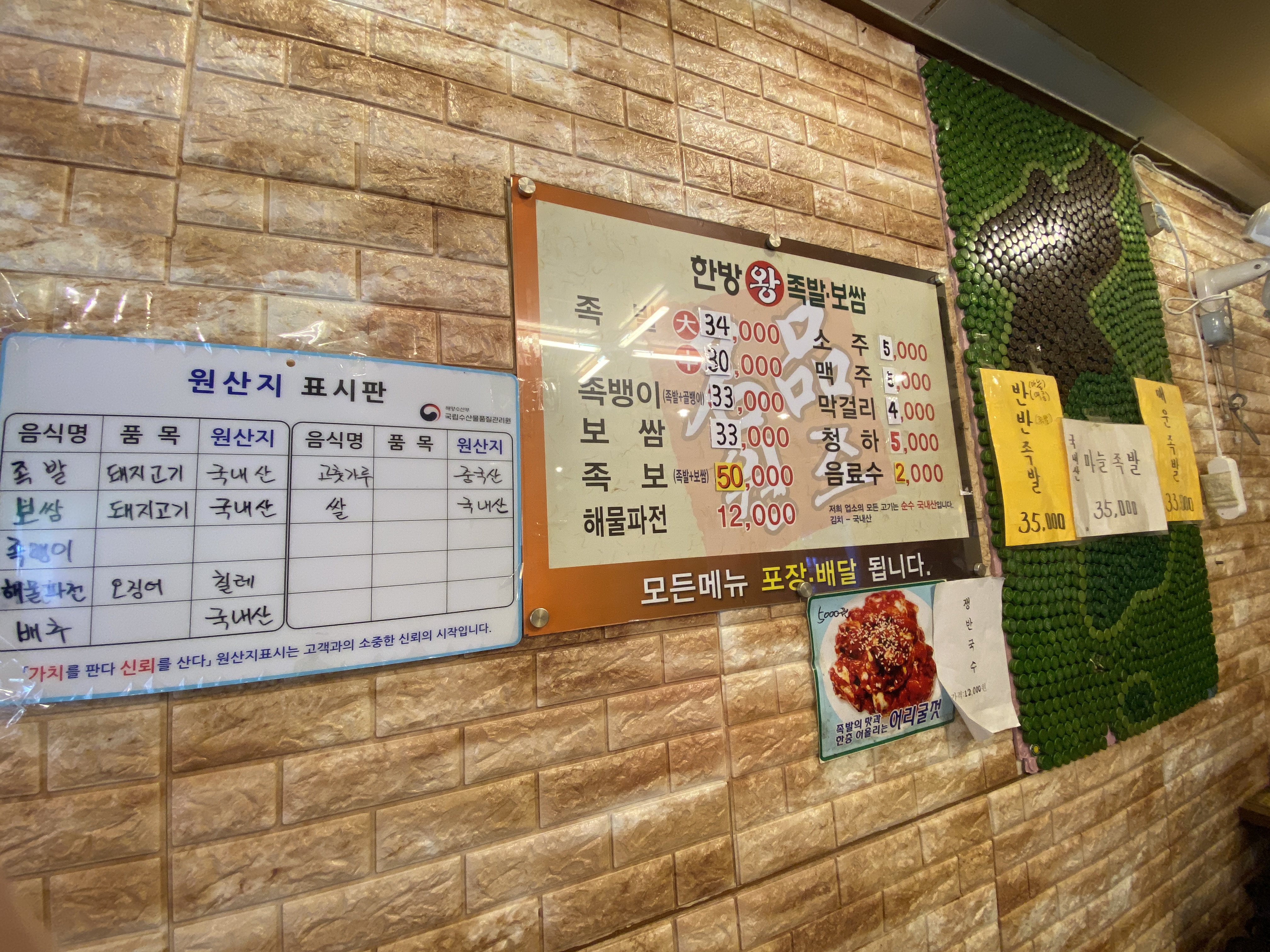 아래 메뉴를 보면, 족발 대자와 중자가 4천원 차이밖에 안나는데, 서빙하는 아주머니가 중자도 양이 괜찮다고 해서 일단 포장을 해왔다. 다행히도 메인 음식들의 원산지는 국내산이다.