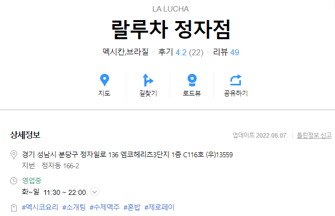 그동안 멕시코 음식을 먹는다고 하면, 타코보다는 퀘사디아를 더 좋아했고, 이런 취향을 반영하듯, 멕시코 음식이 땡기면 거의 온더보더만 갔었다. 이것저것 구경도 할겸, 광화문하고, 삼성점을 주로 방문했는데, 이번에는 정자동 카페거리쪽에 위치한 정자동 랄루차에 퀘사디아를 먹으러 방문했다.