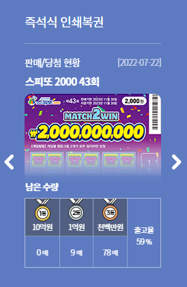 스피또 2000을 확인해보자. 현재 43회차를 진행중에 있는데, 42회차 1등 당첨자가 전부 나오지 않았기 때문에 42회차도 판매가 되고 있다.