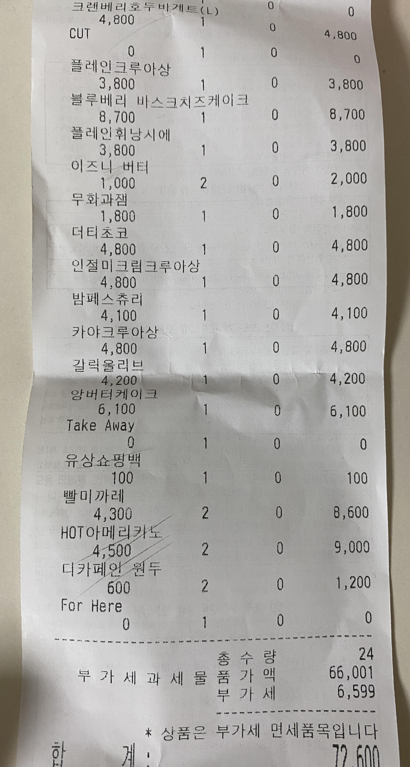 엄청 맛있게 먹었는데, 자주 먹는 가게가 아니어서 그런지 사진과 빵 이름이 매칭이 안된다. 다만 영수증을 첨부해본다. 대략 이정도의 가격대가 있는 곳이다. 생각보다 그렇게 비싸진? 않은?...그런 빵집..??