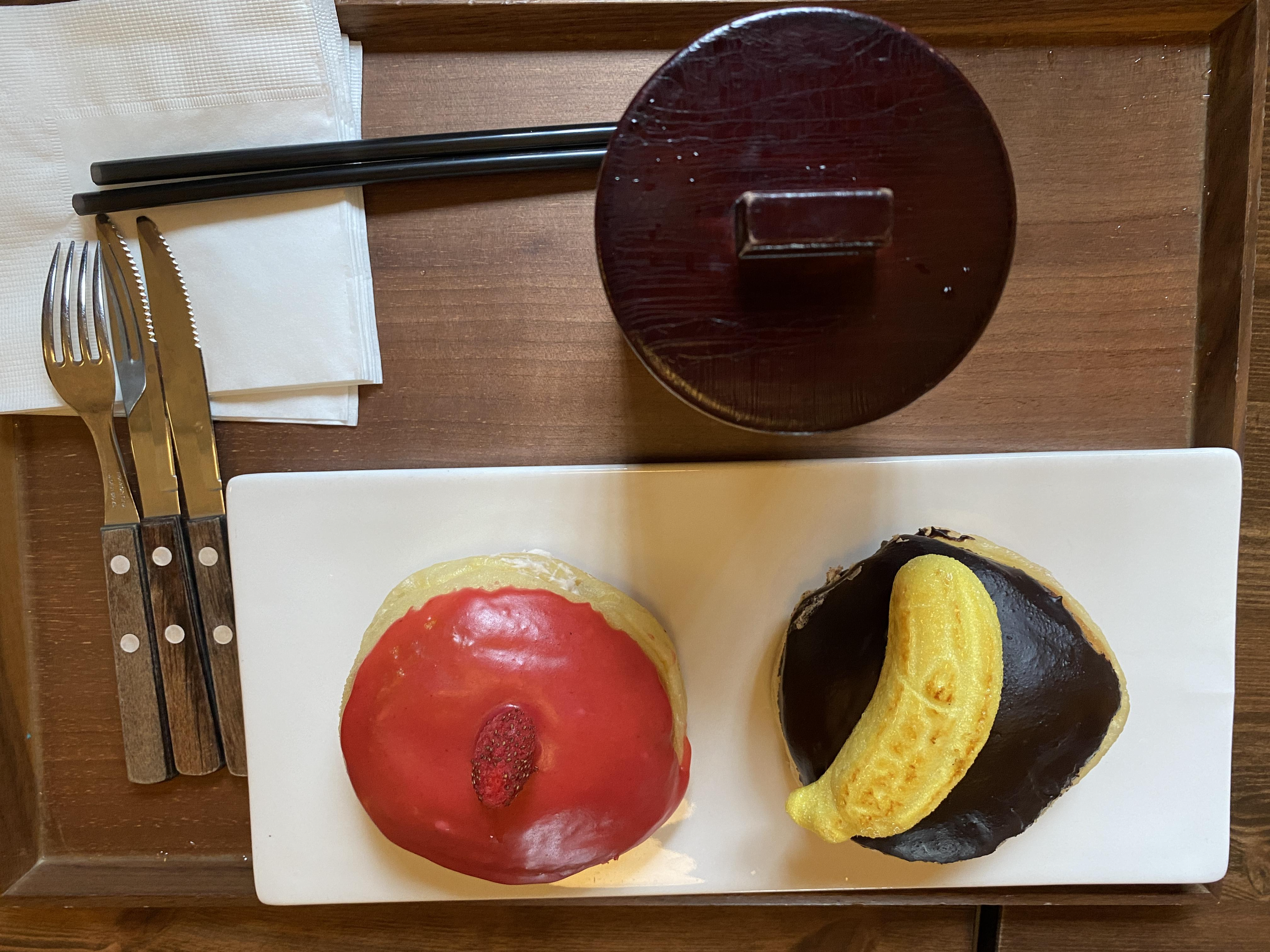 어떤걸 먹을까 고민했으나, 시그니처 메뉴는 건너뛰고 다른 가게에서도 있을법한 도넛2개를 골랐다. 딸기 도넛과 초코 바나나. 눈에 보이는 모습에서 상상할 수 있는 그런맛이다. 바나나처럼 생긴것은 잘 구운 마쉬멜로다. 아이스아메리카노는 양이 좀 적었지만, 괜찮았다.