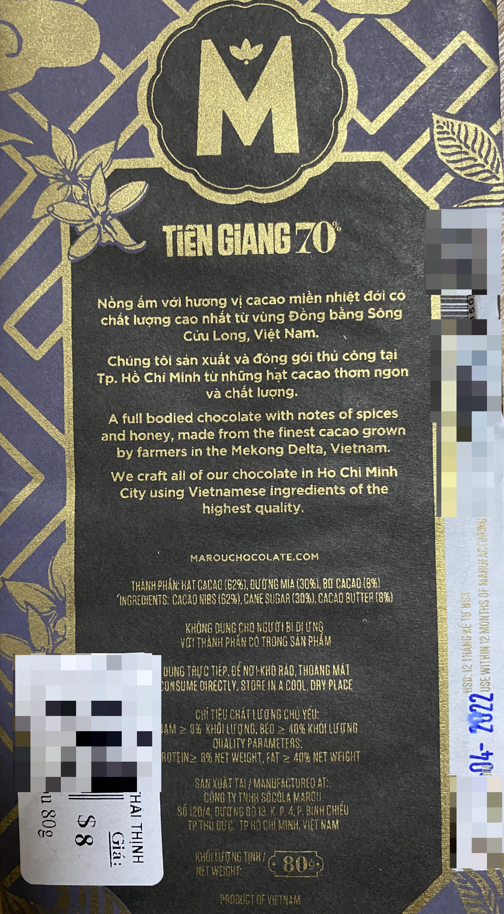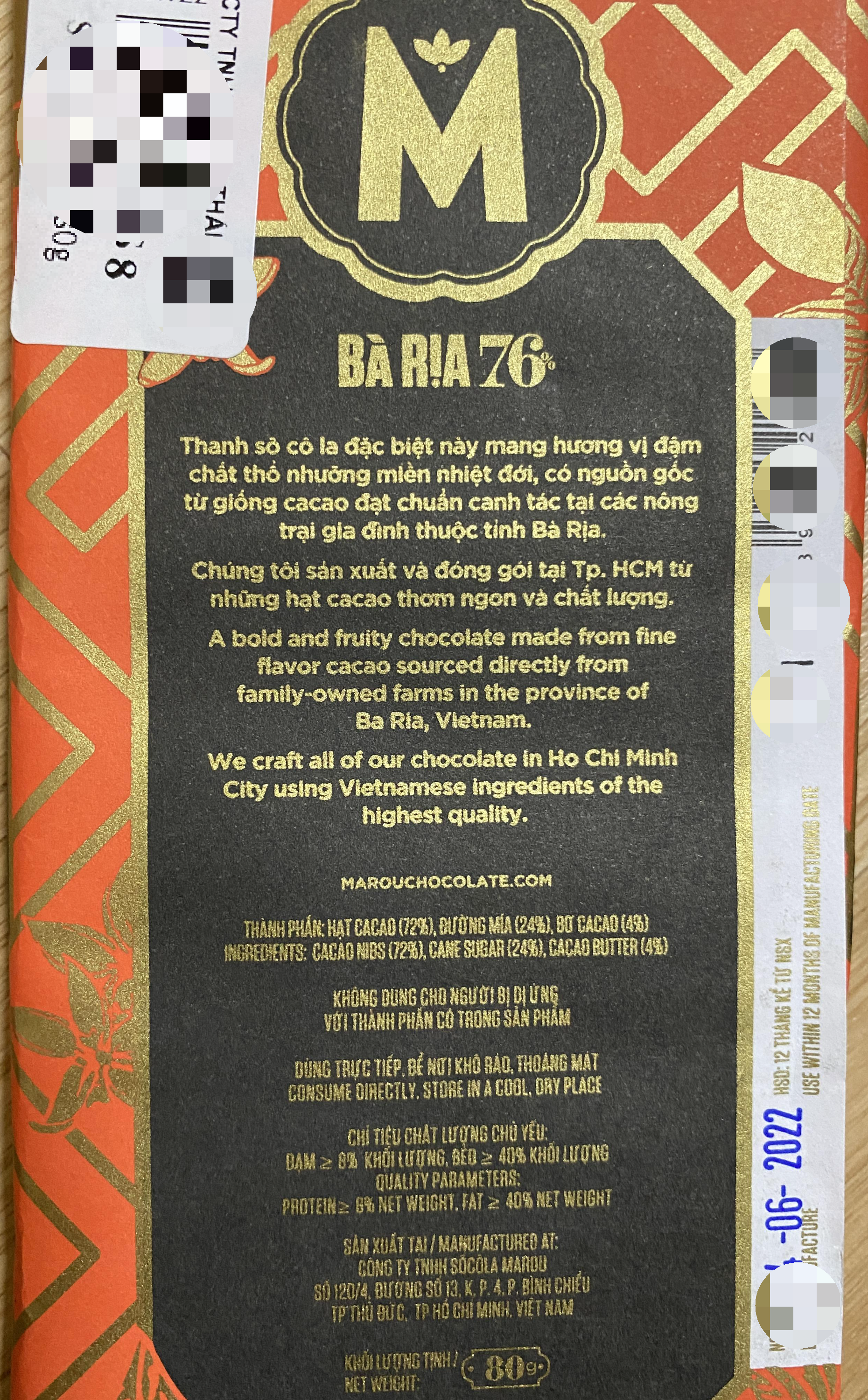 뒷면을 보니, 호치민에서 만들어졌다고 한다. 외국물 먹은 초콜렛이다. 포장도 상당히 고급스럽고 무게도 80g정도나 되는걸 보니 고급 초콜렛에 속하는것 같다. 맛또한 훌륭하다. 유사 초콜렛들과는 비교할 수 없을 정도로 씁쓸한 단맛이 적나라하게 느껴졌다. 우열을 가릴 수 없을 정도로 둘다 괜찮다. 당연히