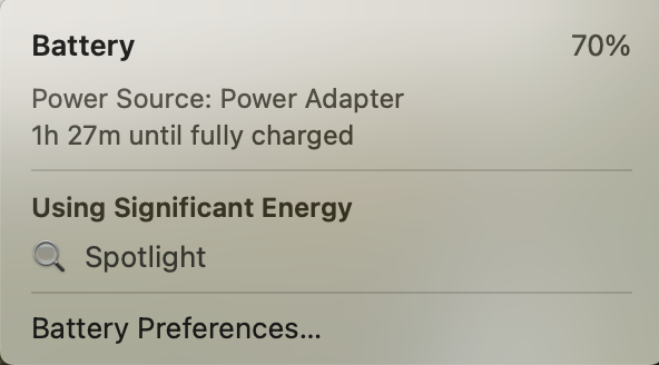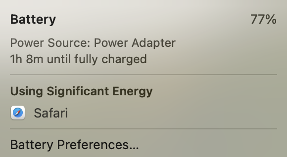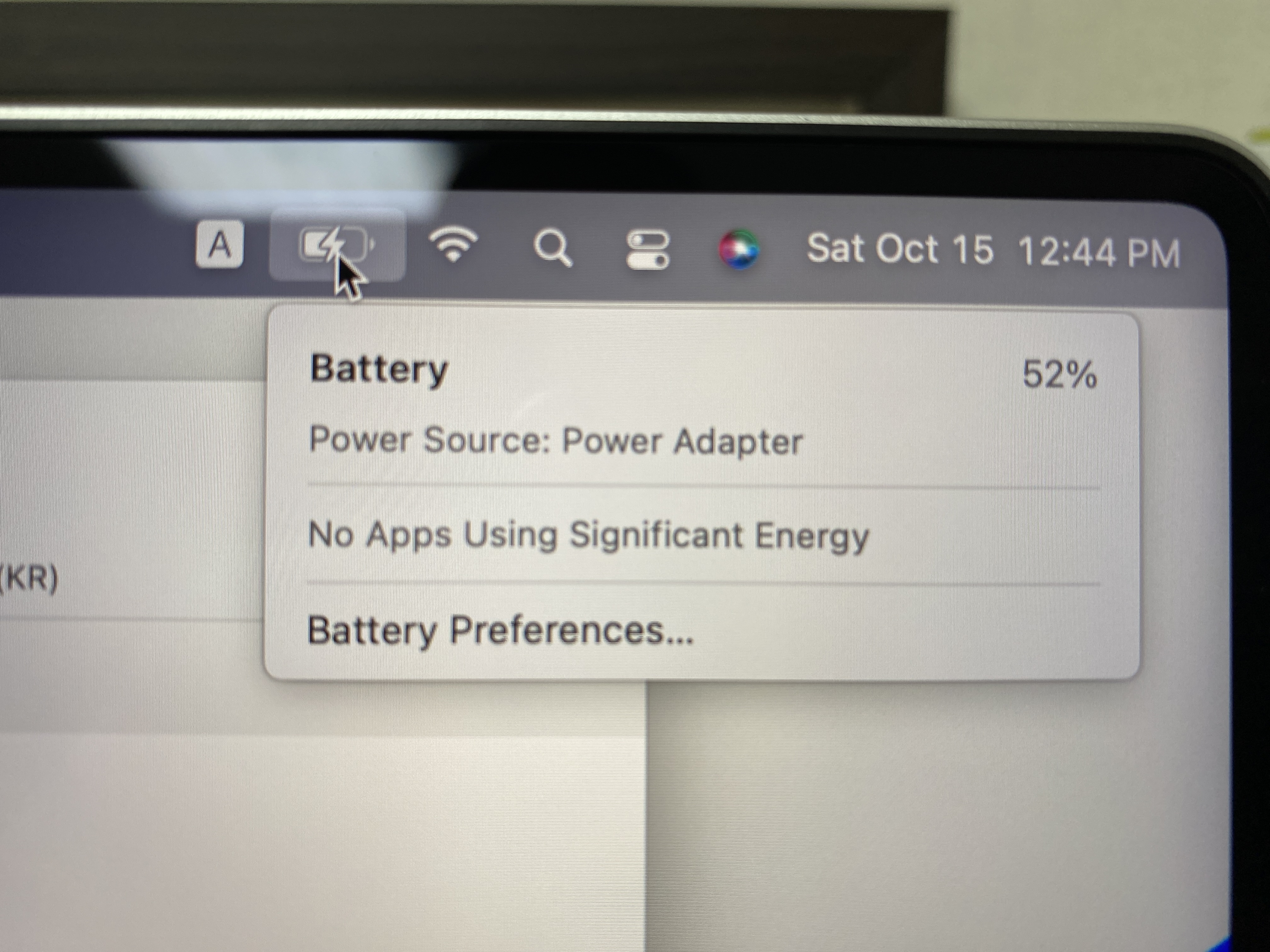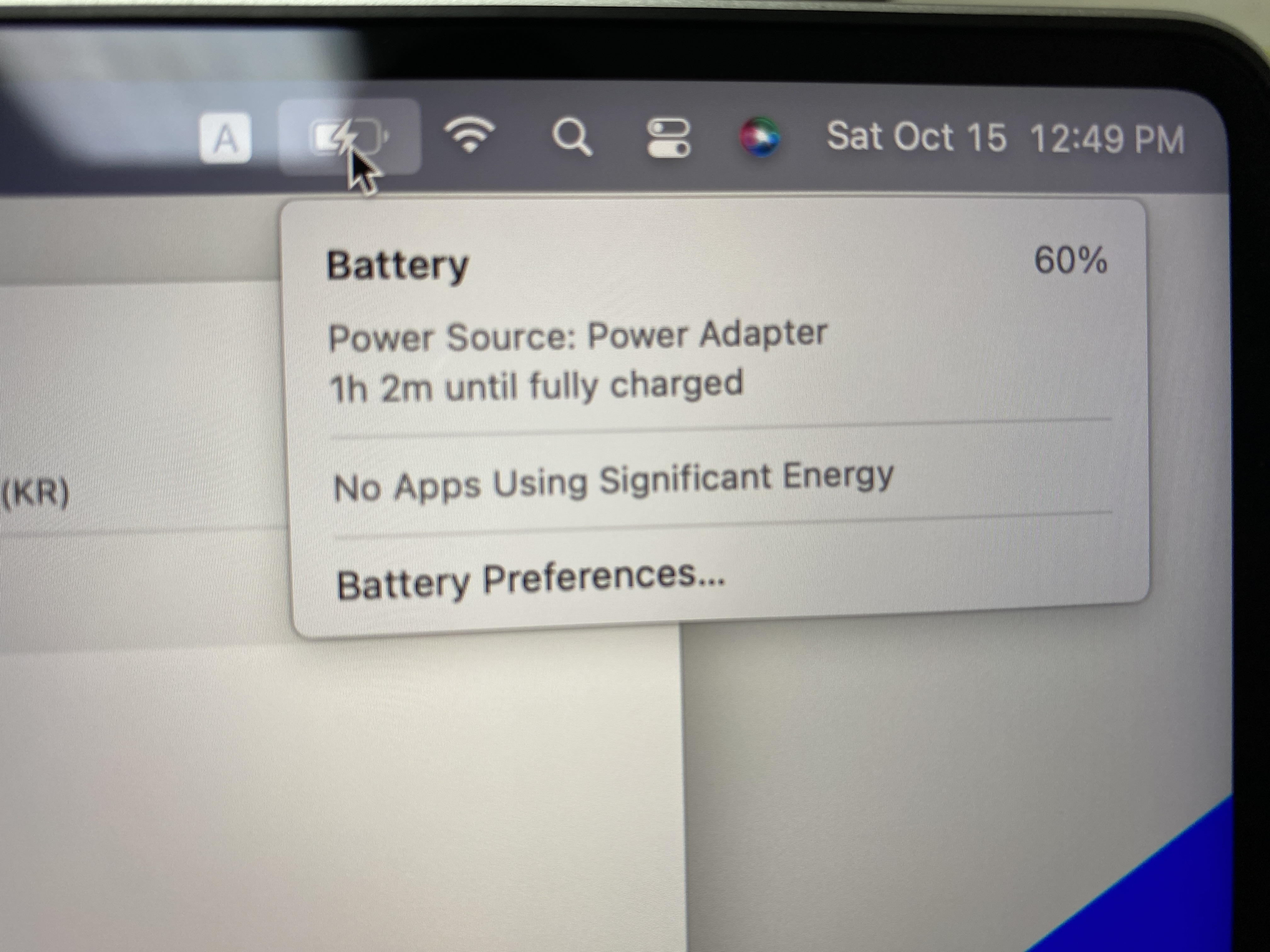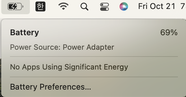 한 20초 정도 더 시간이 흐르고 나니, 완충까지 걸리는 시간도 알려준다. 현재로서는 맥북가지고 고성능이 필요한 작업을 하고 있지 않기 때문에, 충전기를 꼽고 지낼 필요도 없지만, 혹시나 외출시에 내 어깨와 허리를 위한 약간의 마음의 위안이랄까??