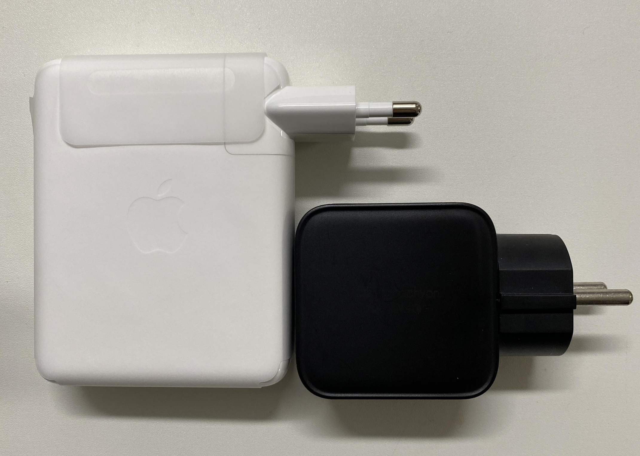 기존 제공 140w 충전기와 클레버 타키온 75w GaN 3포트 접지형 PD 고속멀티충전기 G12CA를 간단히 외관만 비교해봤다. G12CA는 무게가 대략 160g 정도로 거의 40% 정도 무게가 절감되는 수준이었고, 부피가 거의 1/3 수준으로 줄어들어서 맥북 충전용 뿐만이 아니라, 아이패드, 아이폰등의 다양한 제품들의 충전 용도로 충분히 만족스럽게 사용할 수 있었다.