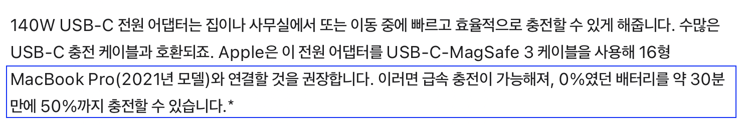 내가 이번에 구입한 맥북프로 16인치 m1pro 모델에는 기본적으로 140W 충전기와 케이블가 포함되어 있는데, 100w의 배터리를 충전해야 하는 유저들의 걱정을 덜기 위해 급속 충전 기능을 제공한다. (50% 충전하는데 30분)