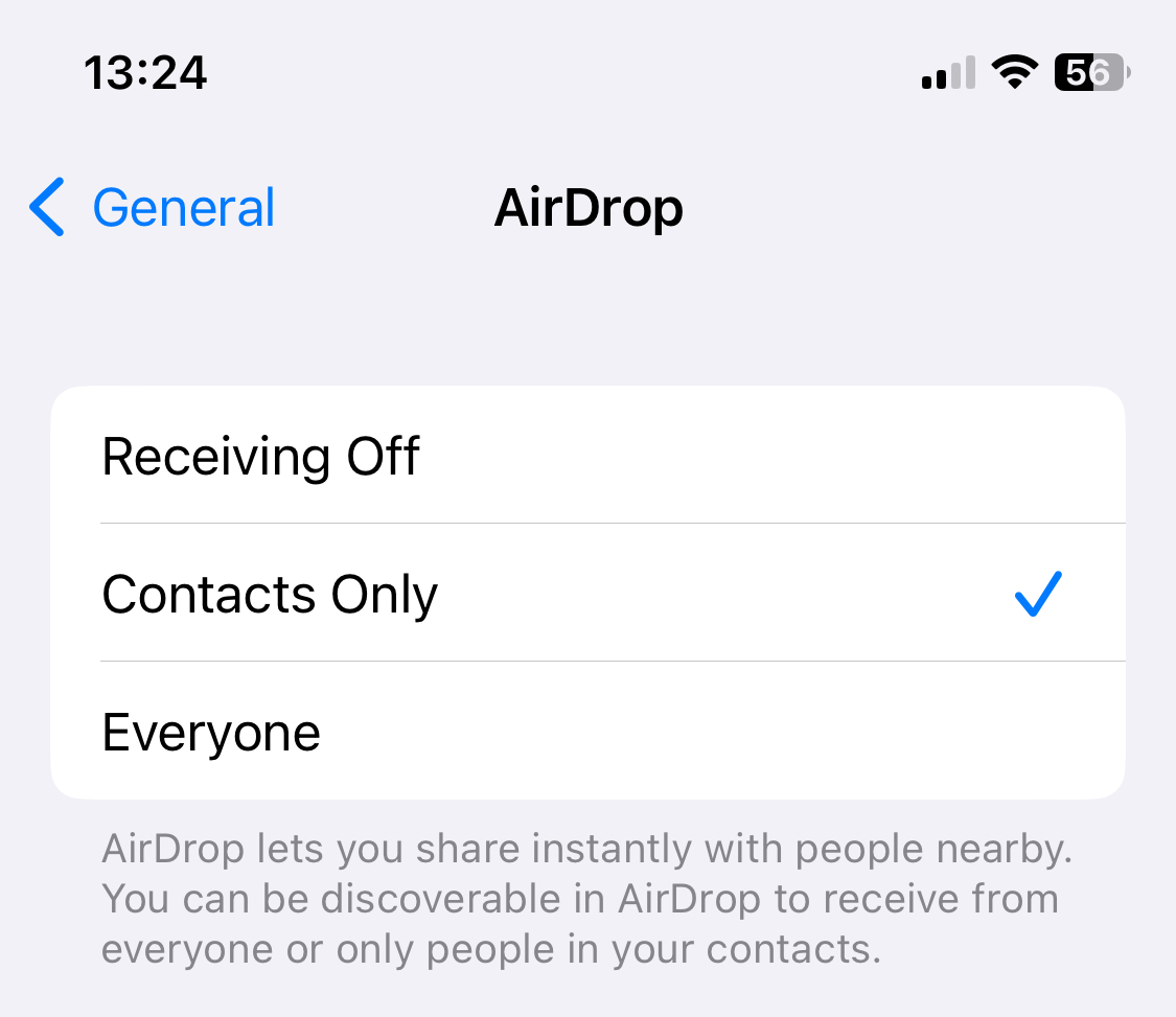 참고로 아이폰의 설정-일반-에어드랍에서 수신끔/연락처만/모든 사람을 선택해서 에어드랍 파일 공유를 원하는 대상을 선택할 수가 있다.