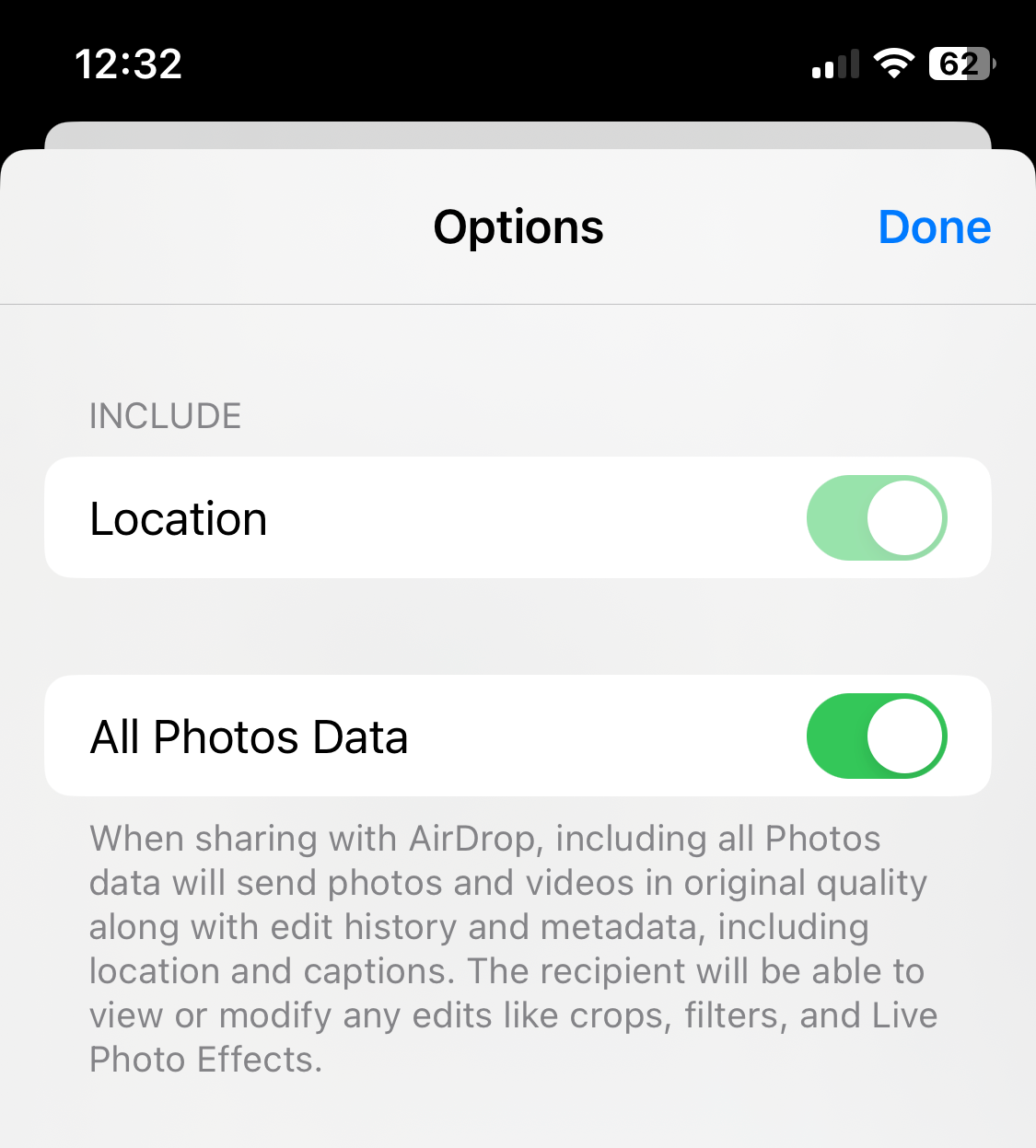 대충 해석하면 다음과 같다. "에어드랍으로 사진과 비디오 공유를 할 때, 편집 정보 그리고 메타데이터를 포함한 모든 데이터를 오리지날 퀄리티로 보낸다. 받는쪽에서는 크롭, 필터, 라이브 포토 같은 어떤 편집 상황이라도 확인하거나 조절할 수 있다."