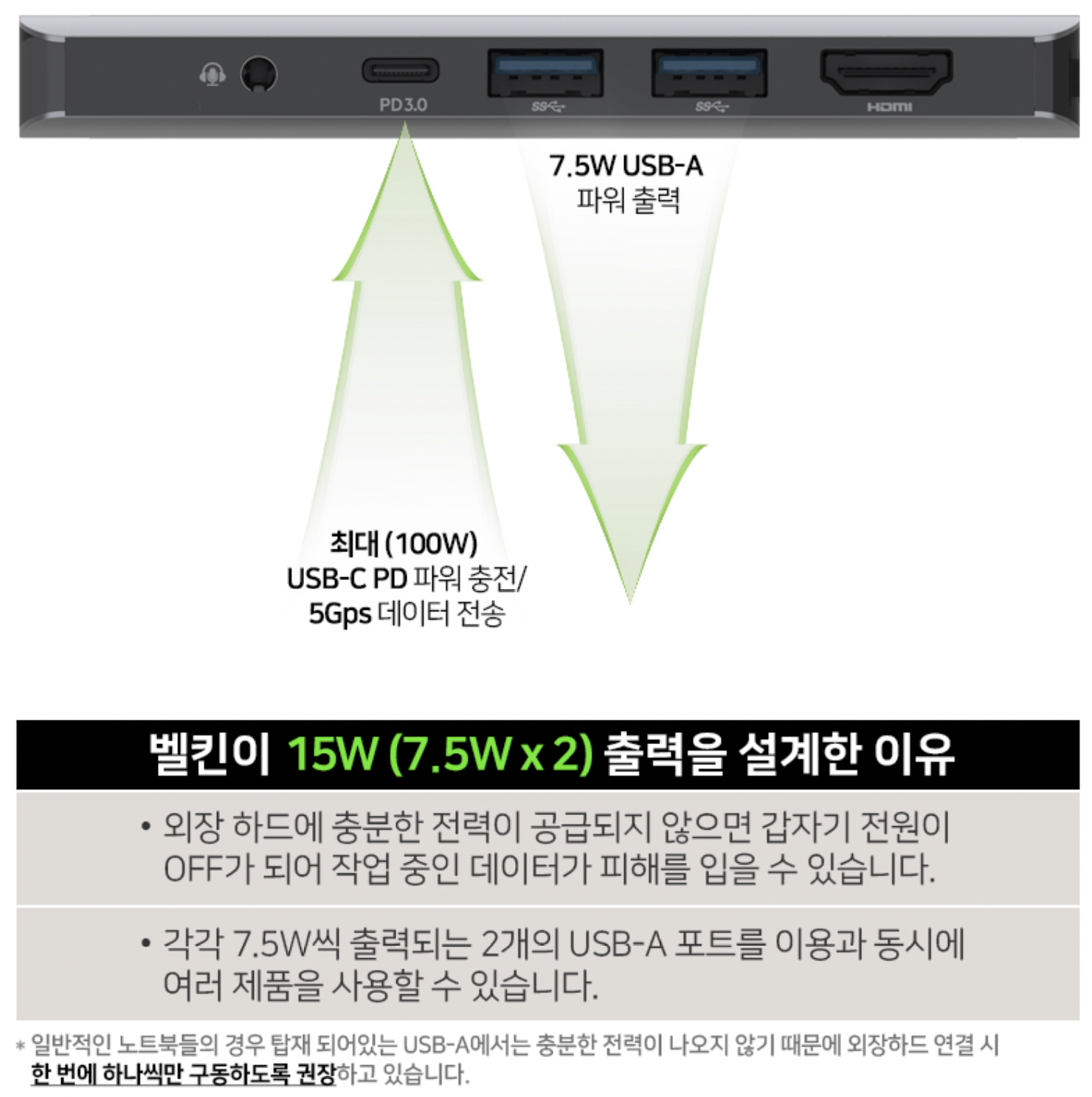 avc009bt : 원래 6만원 정도에 판매가 되는데 쿠폰덕분에 5만원 중반대로 구입할 수 있었다. 위에서 적다가 말았는데, 아래는 avc009bt에 대한 판매처 사진으로, USB-C를 통해 100W까지 안정적인 전원 공급이 되고, USB-A 단자 각각에 7.5W 파워 출력이 가능해서 외장하드에 충분한 전력이 공급이 되며, 안정적인 사용이 가능하다는 것이다.