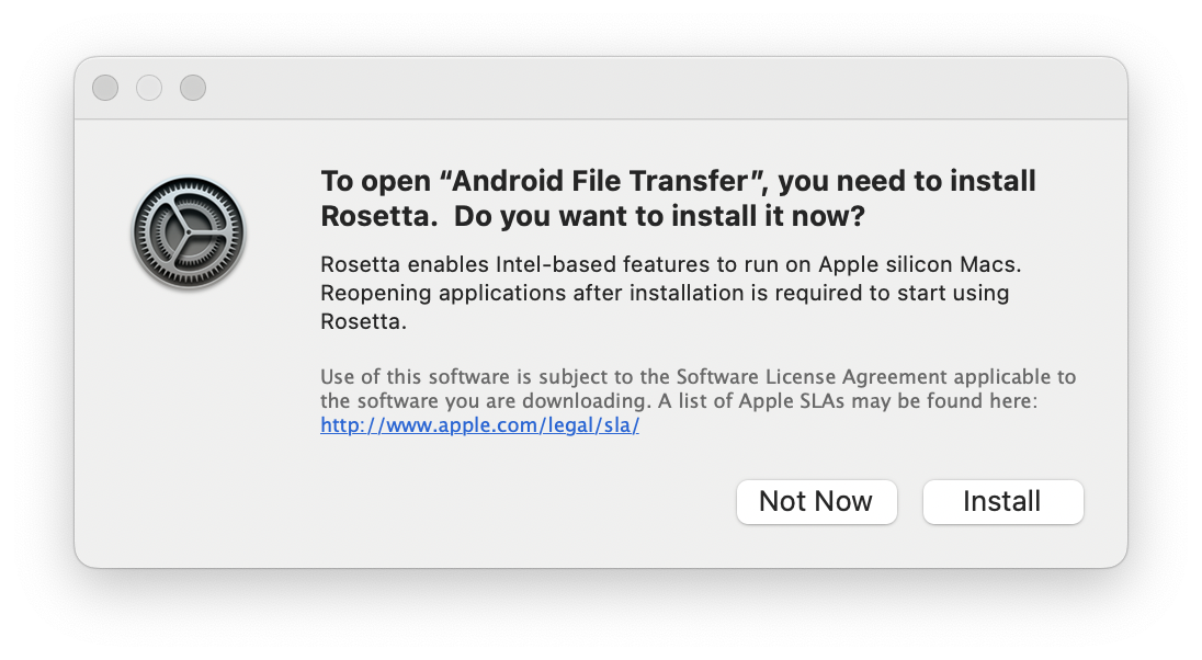 그러면 로제타라는 말이 나온다. 오오...드디어 만나게 된 로제타...로제타는 인텔 기반으로 만들어진 것을 애플 실리콘 맥에서도 작동하게 만들어준다고 한다. 설치 후에 android file transfer를 다시 열어주면 된다고 한다.