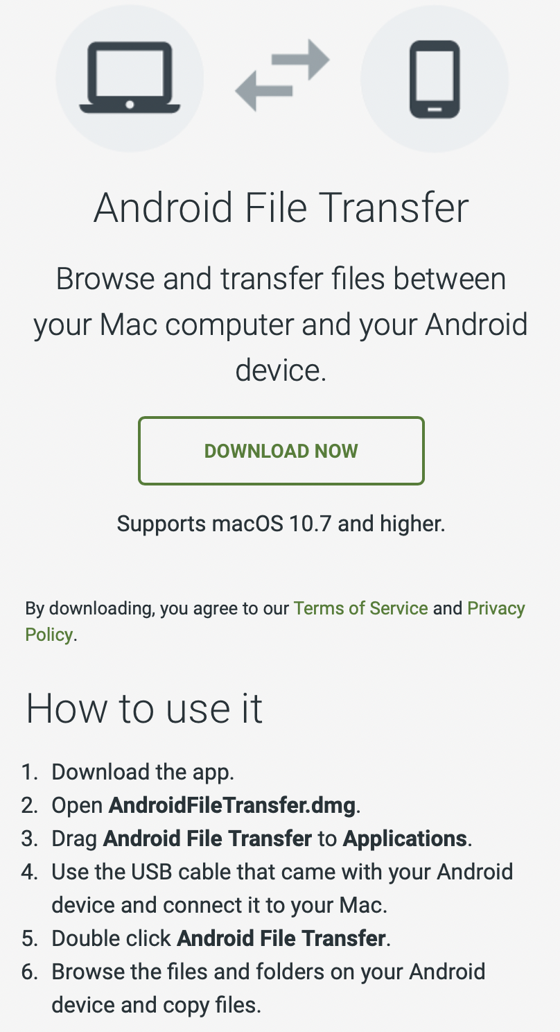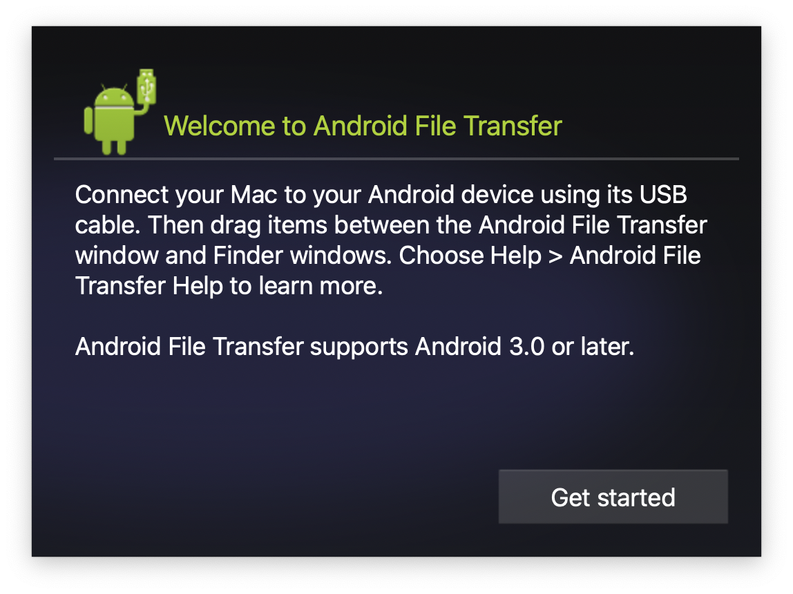 Android File Transfer Browse and transfer files between your Mac computer and your Android device. Download now For Mac OS X only. No extra software is needed for Windows. Supports macOS 10.7 and higher.