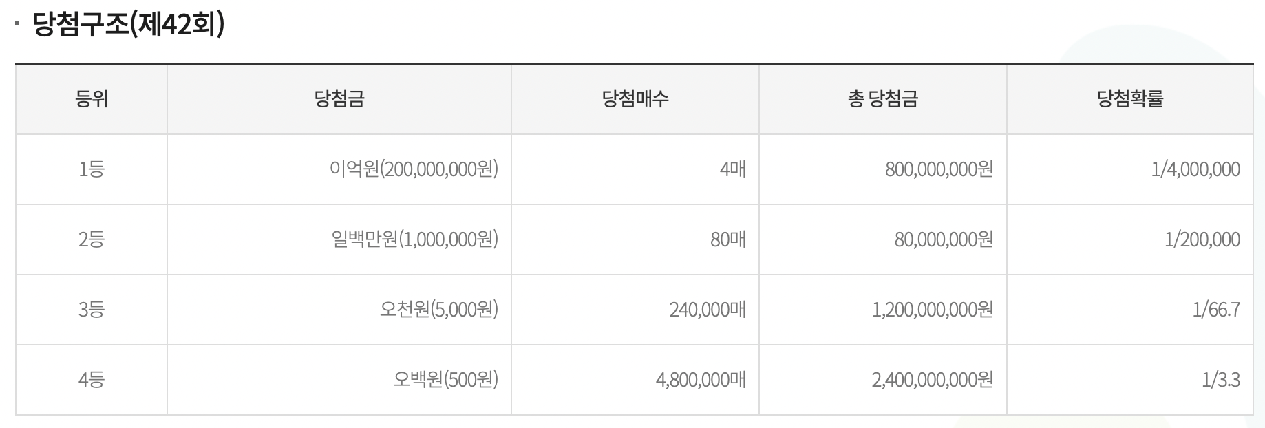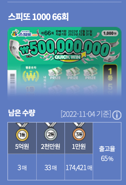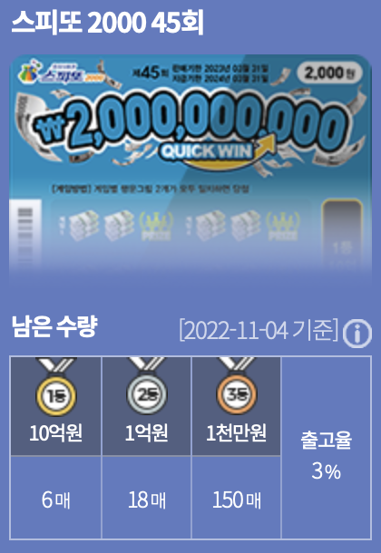 스피또500의 당첨구조는 아래와 같은데, 출고율이 절반이 넘은 것에 비해, 아직 1등은 4장 중에 3장이나 남아있고, 2등역시 아직 절반 넘게 남아있다. 스피또500 42회차는 계속 구입할 계획이다.