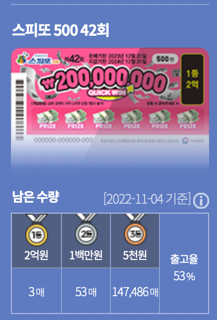 먼저 스피또500은 우리 동네에서는 42회차만 판매하고 있다. 출고율은 53%이고, 남은 수량은 아래와 같다.