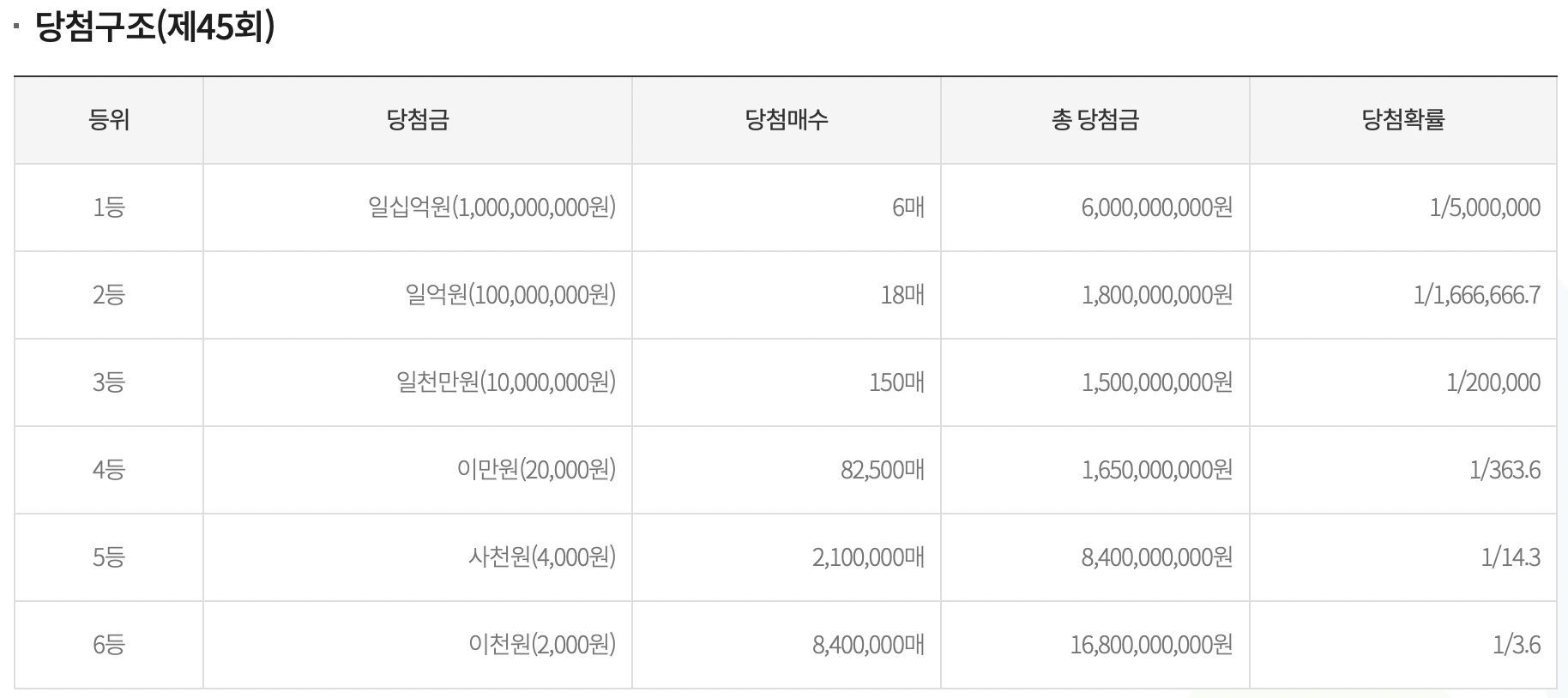 당첨구조는 아래와 같다. 아래와 같이, 구할 수만 있다면 44회차를 구입하면 1등 확률이 상당히 높아진다.