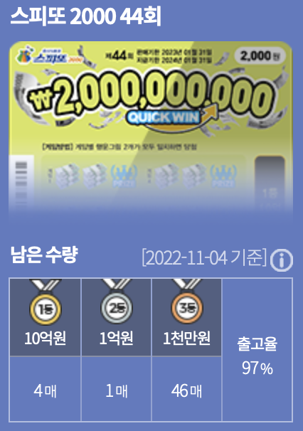 스피또2000은 내가 구입하진 않지만, 사람들이 관심있을 것 같아서 추가로 정리를 해봤다. 아마 동네마다 다를건데, 우리동네에는 44회차가 없을 확률이 100%다..왜냐하면 출고율이 97%수준이기 때문이다. 아직 1등이 4개나 남았는데 팔지를 않는다...일단 44회차가 보이면 구매하는 걸로....
