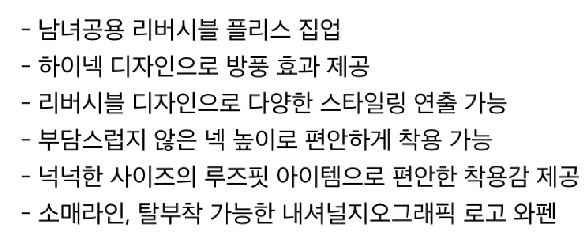 전면 디자인도 마음에 들었지만, 후면에 아무것도 없이 깔끔해서 더욱 마음에 들었다. 눈으로 보기에는 거친 느낌이지만, 플리스 질감도 나쁘지 않았다.