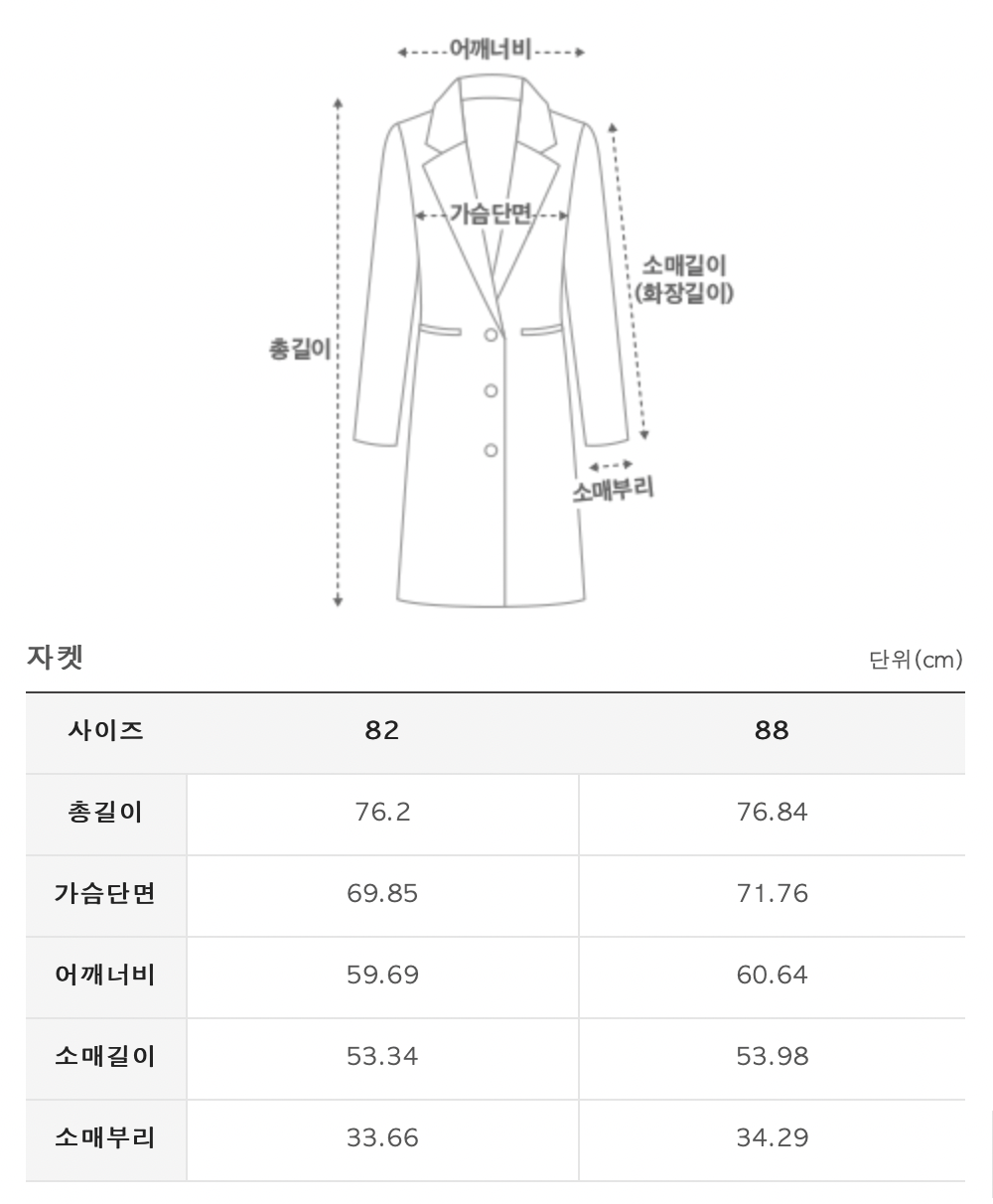 후면 역시 깔끔하다. 다만 아래 사이즈표에서 보듯이 오버핏으로 나온것 같다. 82는 55 사이즈, 88은 66사이즈랑 매칭이 되는데, 총 길이가 왠만한 여성들 엉덩이는 덮을 수 있을 것 같다.