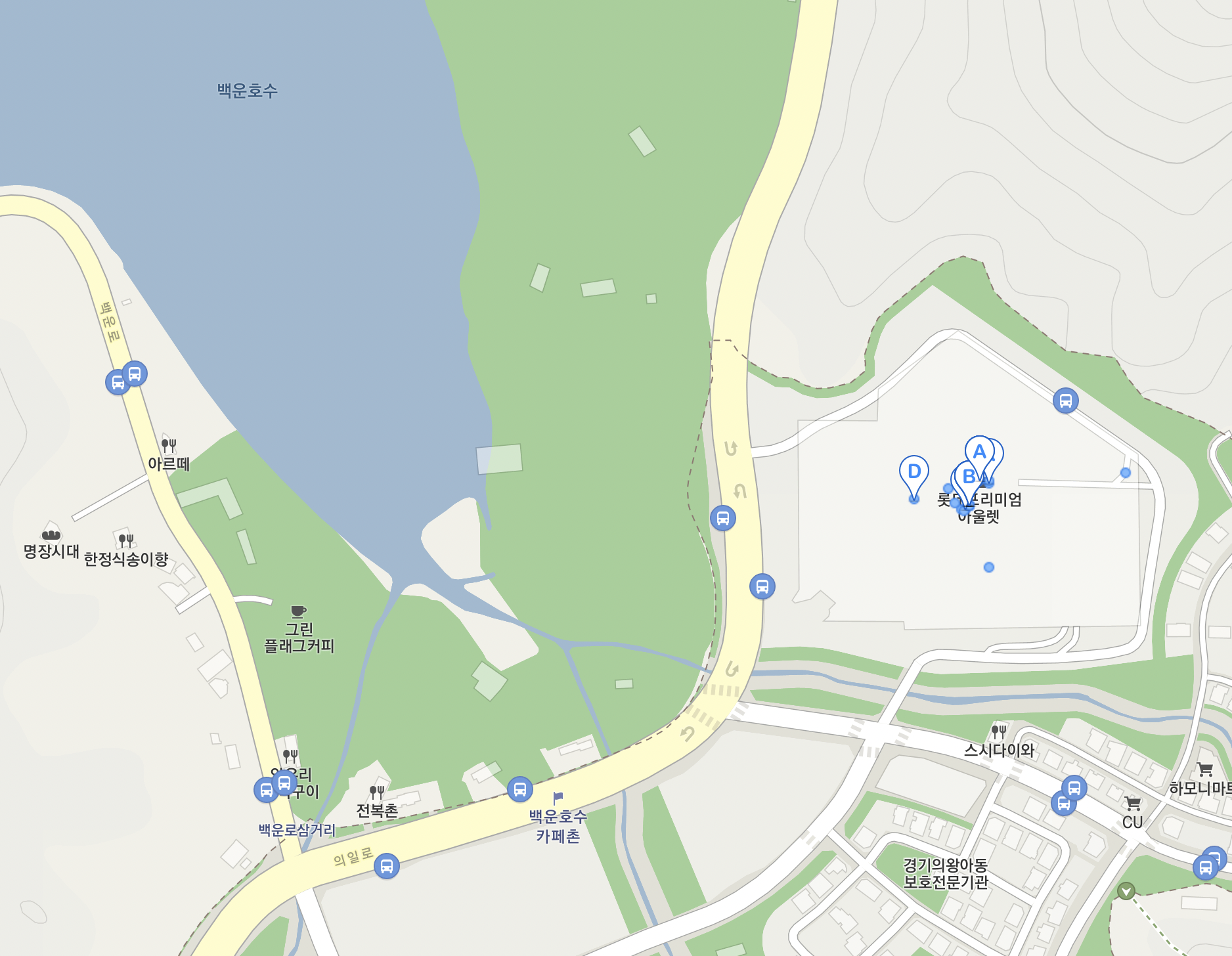 아래 지도에서 보듯이, 의왕 타임빌라스는 백운호수 근처에 있어서, 아울렛 내부가 아니라 외부 주차장을 이용할 경우, 아울렛에서 쇼핑을 마친 후 백운호수를 거닐며 한가로이 산책도 할 수 있는 곳이다. 또한 다른 아울렛들보다는 시내에 가깝게 붙어 있어서 접근성이 월등히 좋은 것도 장점이다.