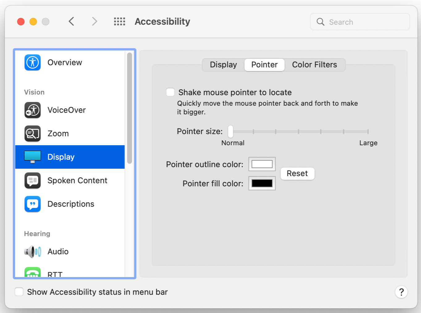 맥북에 마우스를 연결한체로 일정 속도 이상으로 흔들거나, 역시나 트랙패드에서 포인터를 빠르게 움직이면, 포인터 자체의 크기가 확대되는 것을 볼 수 있다. 이 기능은 기본으로 활성화 되어 있는데, 커다란 화면에서 포인터를 쉽게 찾기 위한 방법으로 사용되고 있다.