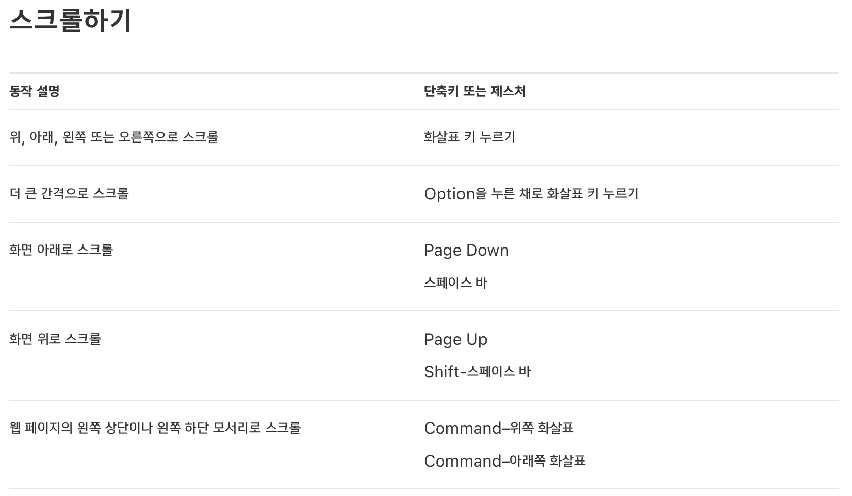사파리 한정으로 스크롤은 아래의 단축키 또는 제스처로 해결이 가능하다.