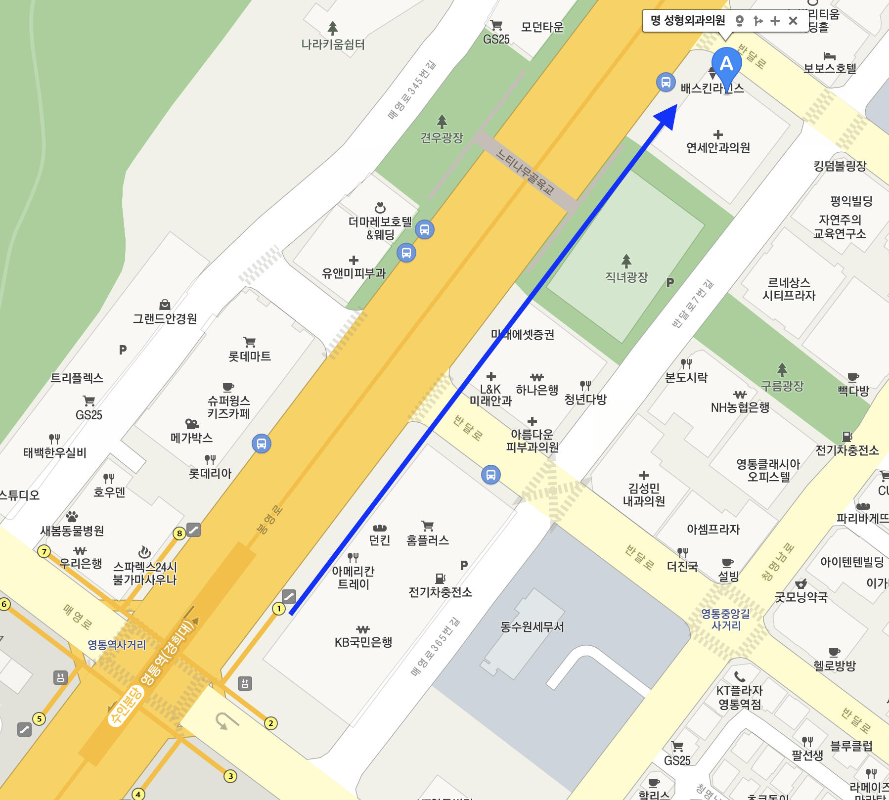아래는 내가 방문한 수원 영통역에 위치한 명성형외과 가는 길이다.