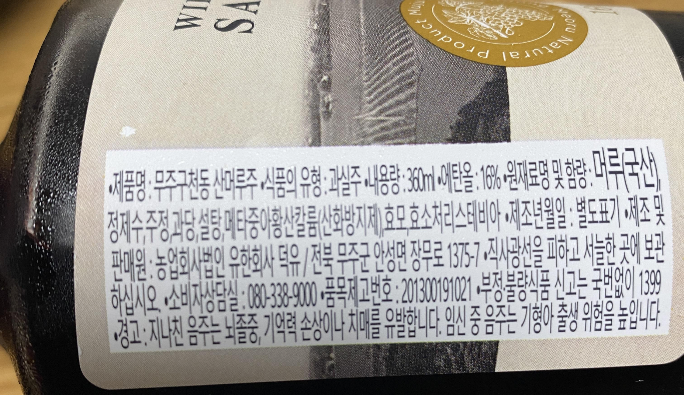 머루가 거의 40%나 들어가 있고, 도수가 16도나 되는데 알콜향이 적어서, 술을 못드시는 분들도 거부감이 적을 것 같다.