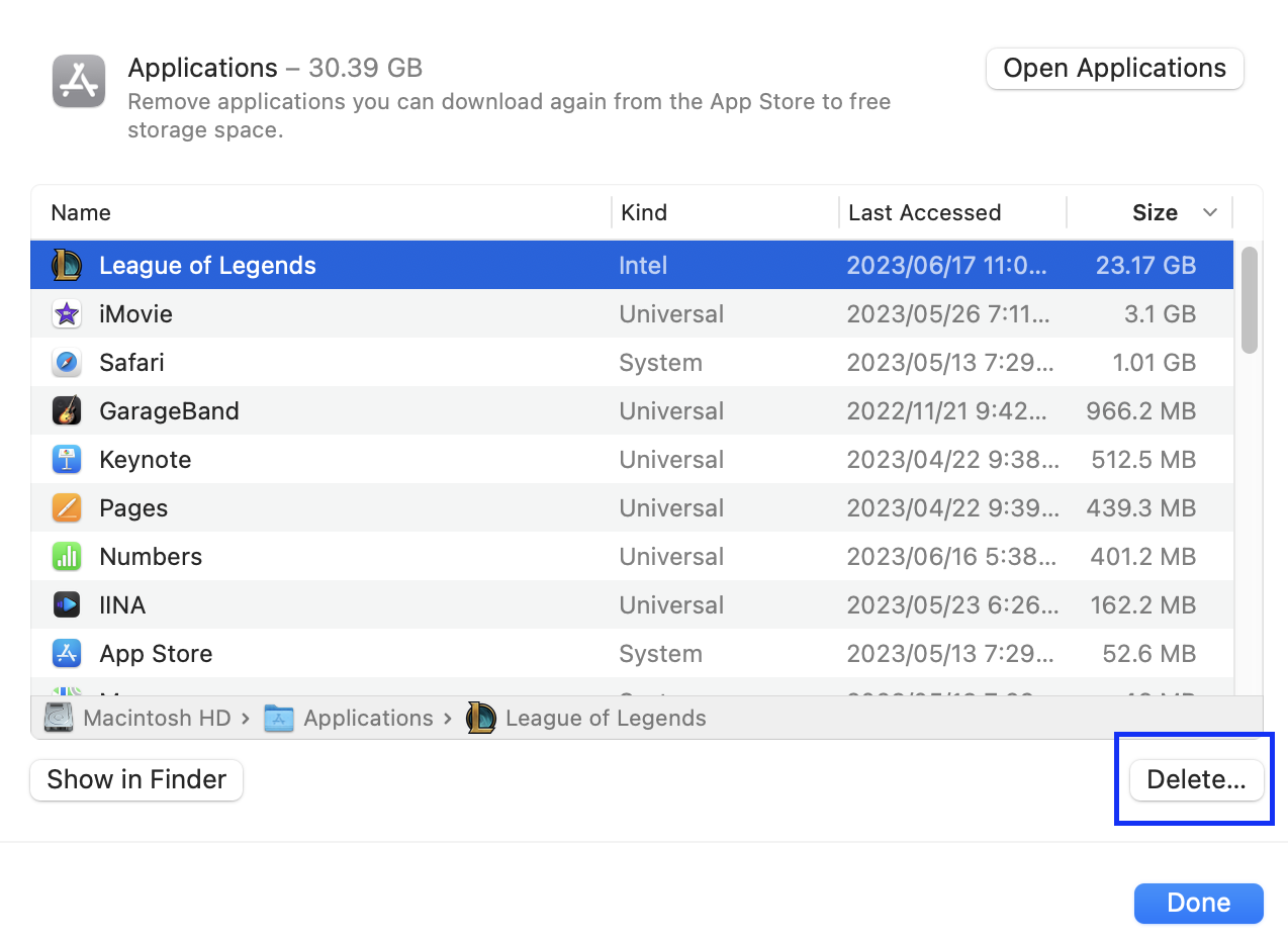 일단 응용프로그램에 설치된 리그오브레전드 게임 자체를 지워보자...