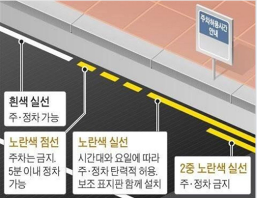 인도와 인접한 경계면 또는 도로 중앙이 황색 복선으로 되어 있는 경우는 어떤 상황에서도 주차가 허용되지 않는다. 황색점선으로 되어 있는 경우는 5분 이내로 정차가 허용되는 구역이다. 즉 운전자가 차량에 탑승한 상태에서 5분까지 허용된다는 것이다. 아래의 그림으로 간단히 확인 가능하다.