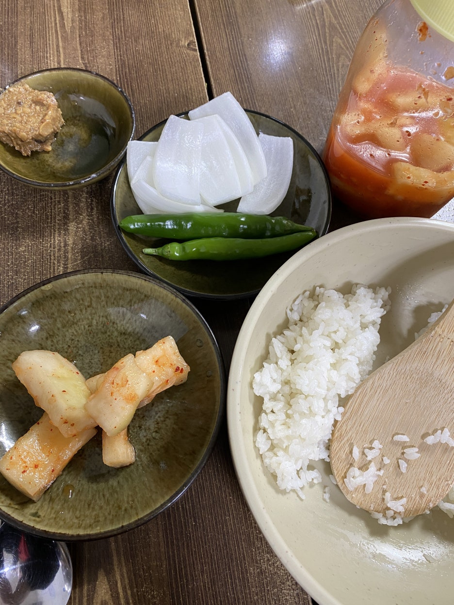 밥 더 달라면 더 준다. 양파는 싱싱했고, 고추는 적당히 매웠다. 깍두기 맛도 시큼하니 괜찮았다. 된장은 짜다.