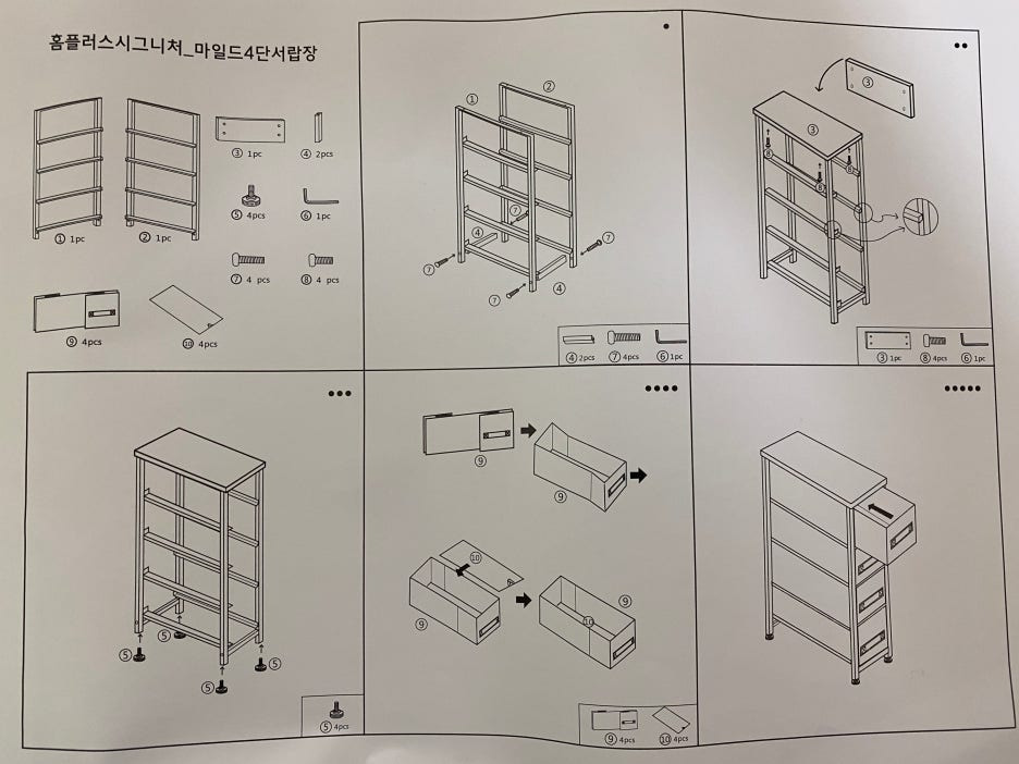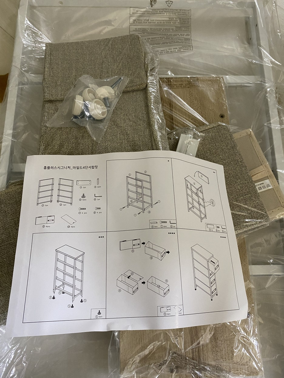조립은 문제 없이 진행했지만, 천으로 된 서랍에서 시큼한 냄새가 난다.