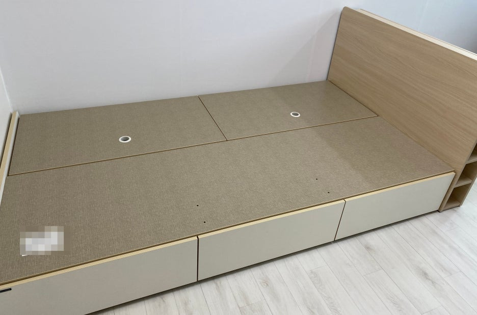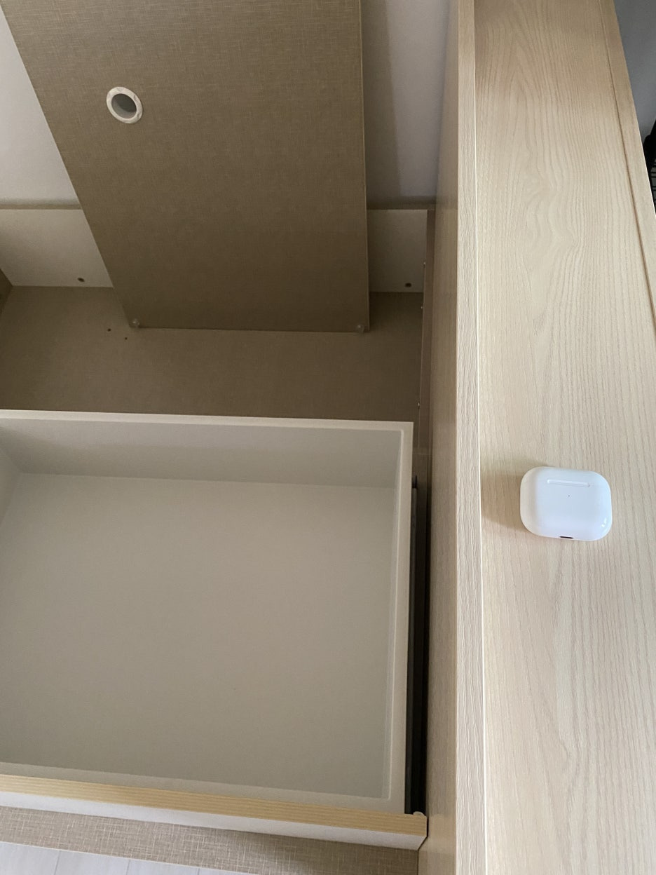 리바트 코코니 수납침대는 내가 못찾은걸수도 있지만, 침대헤드가 없다. 크기를 체감하기 위해 에어팟3이랑 비교해 놨는데, 딱 적당한 깊이로 헤드가 구성되어 있어서 휴대폰 뿐만 아니라 그 위에 이것저것 필요한 것들을 제법 올려 놓을 수 있고, 오픈된 서랍칸이, 플라스틱 서랍과 함께 제공되어, 양말이라든지, 자잘한 짐들을 넣기가 정말 좋게 되어 있다. 물론 선반이 탈부착되서, 책도 꽂을 수 있다.
